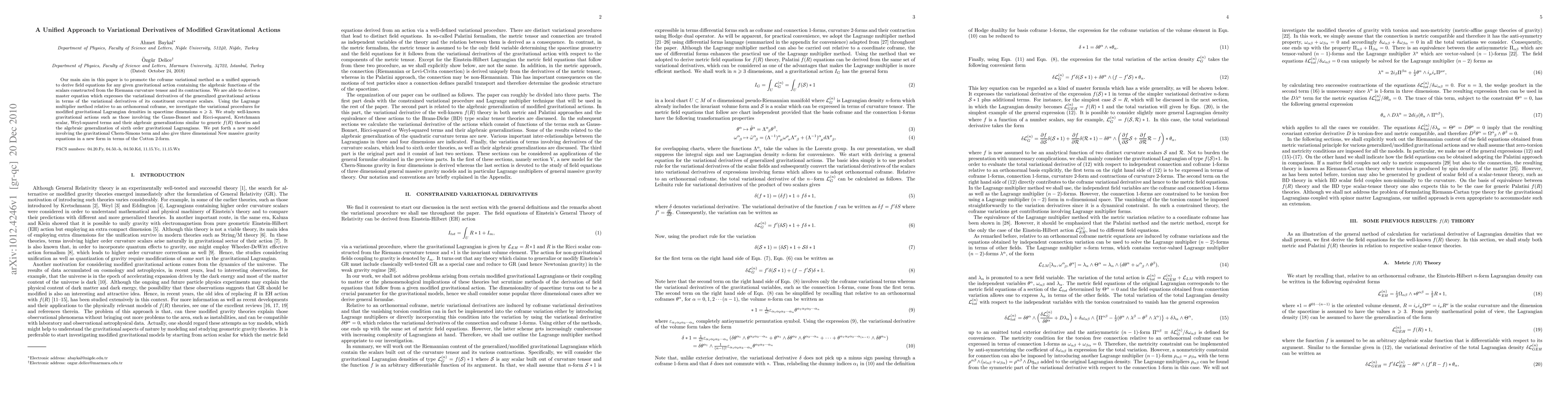 This paper introduces a coframe variational method to derive field equations for various modified gravitational actions, including Gauss-Bonnet, Ricci-squared, and $f(R)$ theories. It presents a unified approach to express variational derivatives of generalized gravitational actions through curvature scalars, introducing a new model involving gravitational Chern-Simons terms and reformulating New massive gravity equations using the Cotton 2-form.