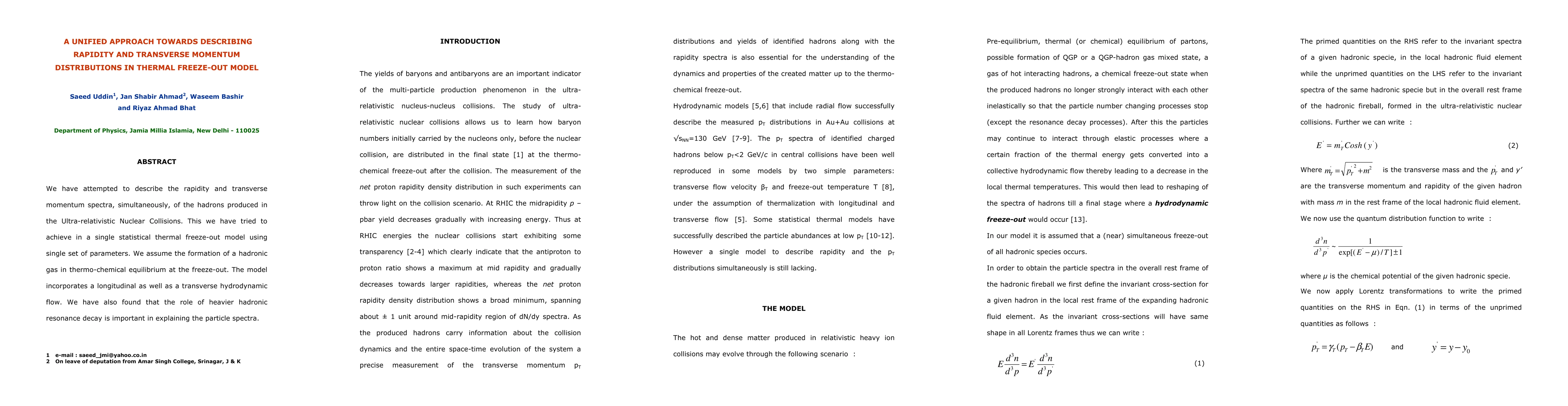 We have attempted to describe the rapidity and transverse momentum spectra, simultaneously, of the hadrons produced in the Ultra-relativistic Nuclear Collisions. This we have tried to achieve in a single statistical thermal freeze-out model using single set of parameters. We assume the formation of a hadronic gas in thermo-chemical equilibrium at the freeze-out. The model incorporates a longitudinal as well as a transverse hydrodynamic flow. We have also found that the role of heavier hadronic resonance decay is important in explaining the particle spectra.