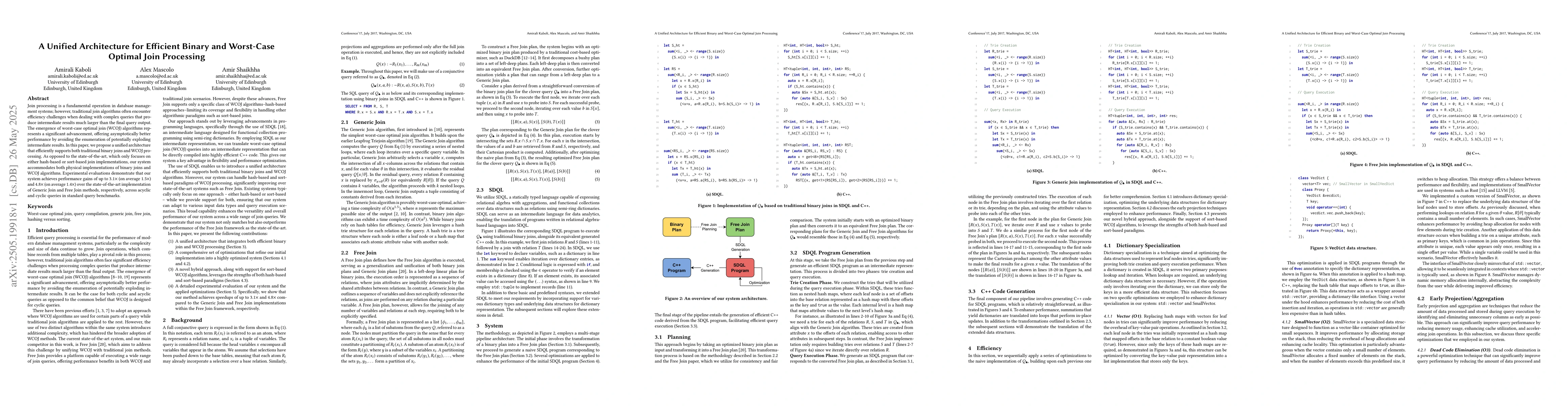 The paper proposes a unified architecture integrating both traditional binary joins and worst-case optimal join (WCOJ) processing, contrasting with existing systems focusing solely on hash-based or sort-based join implementations.
