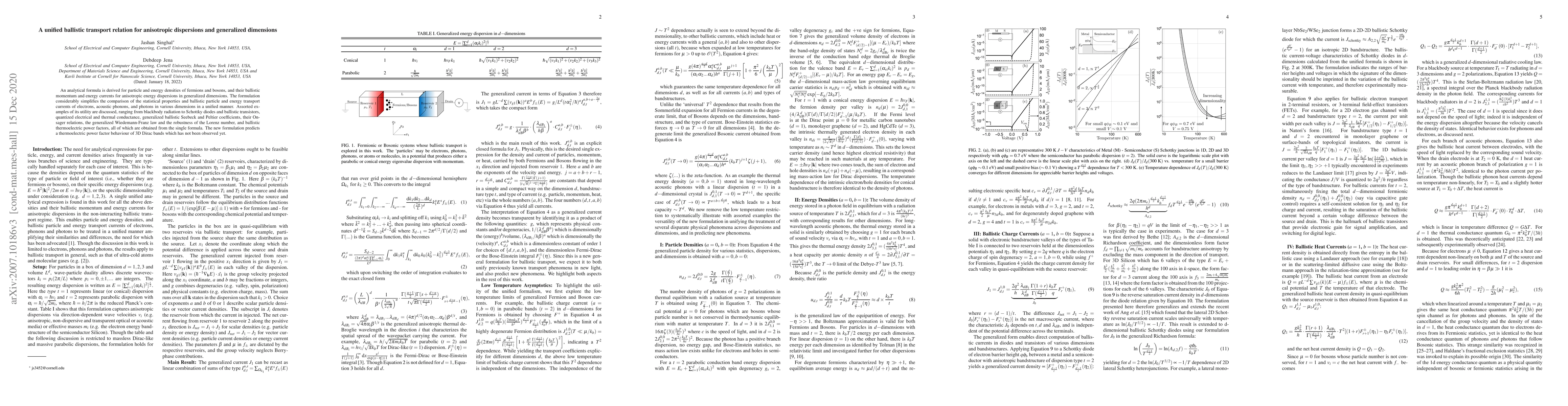An analytical formula is derived for particle and energy densities of fermions and bosons, and their ballistic momentum and energy currents for anisotropic energy dispersions in generalized dimensions. The formulation considerably simplifies the comparison of the statistical properties and ballistic particle and energy transport currents of electrons, acoustic phonons, and photons in various dimensions in a unified manner. Assorted examples of its utility are discussed, ranging from blackbody radiation to Schottky diodes and ballistic transistors, quantized electrical and thermal conductance, generalized ballistic Seebeck and Peltier coefficients, their Onsager relations, the generalized Wiedemann-Franz law and the robustness of the Lorenz number, and ballistic thermoelectric power factors, all of which are obtained from the single formula. The new formulation predicts a thermoelectric power factor behaviour of 3D Dirac bands which has not been observed yet.