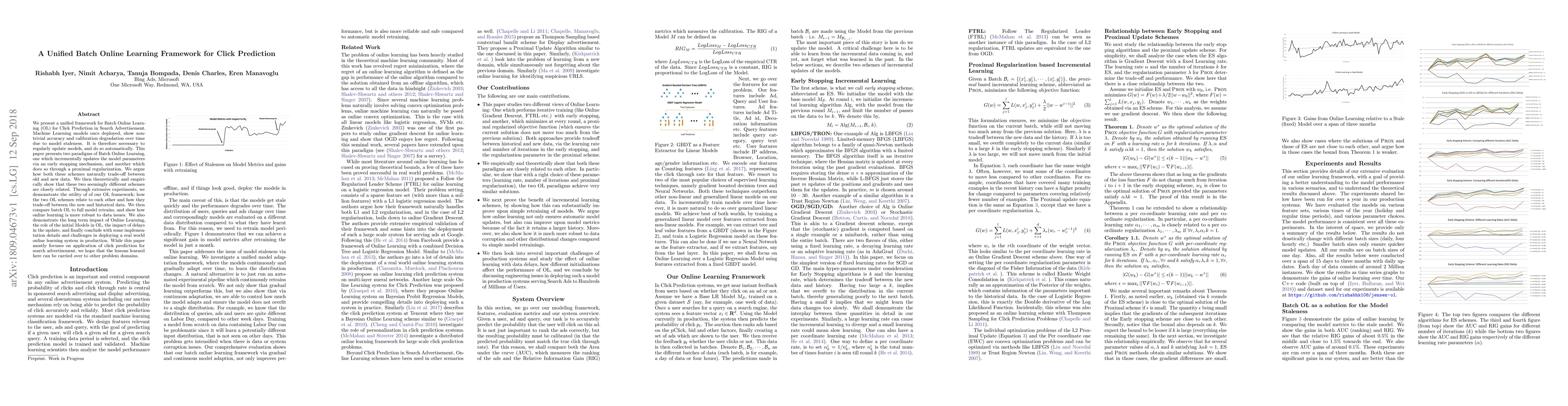 We present a unified framework for Batch Online Learning (OL) for Click Prediction in Search Advertisement. Machine Learning models once deployed, show non-trivial accuracy and calibration degradation over time due to model staleness. It is therefore necessary to regularly update models, and do so automatically. This paper presents two paradigms of Batch Online Learning, one which incrementally updates the model parameters via an early stopping mechanism, and another which does so through a proximal regularization. We argue how both these schemes naturally trade-off between old and new data. We then theoretically and empirically show that these two seemingly different schemes are closely related. Through extensive experiments, we demonstrate the utility of of our OL framework; how the two OL schemes relate to each other and how they trade-off between the new and historical data. We then compare batch OL to full model retrains, and show how online learning is more robust to data issues. We also demonstrate the long term impact of Online Learning, the role of the initial Models in OL, the impact of delays in the update, and finally conclude with some implementation details and challenges in deploying a real world online learning system in production. While this paper mostly focuses on application of click prediction for search advertisement, we hope that the lessons learned here can be carried over to other problem domains.