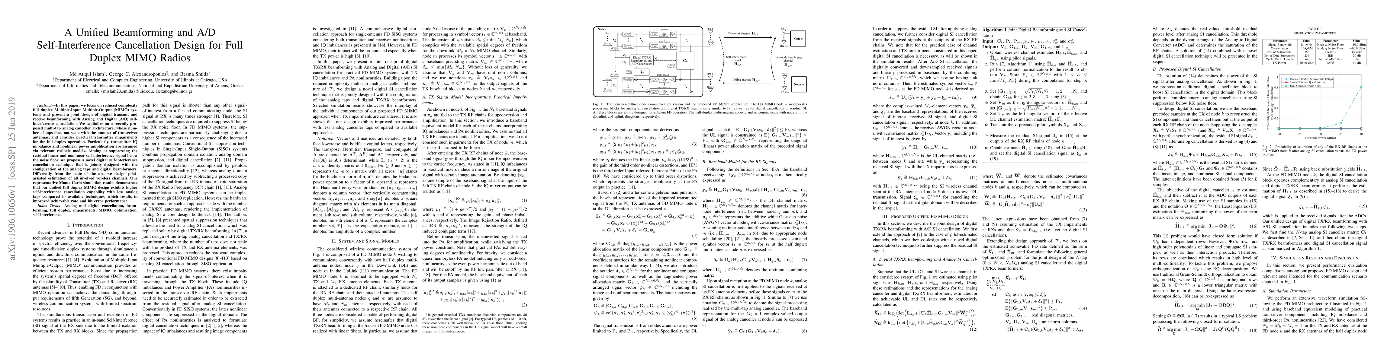 This paper proposes a unified design for full duplex MIMO radios that combines beamforming with A/D self-interference cancellation, leveraging a scalable analog canceller and realistic transmitter impairments models. The novel digital cancellation technique, jointly optimized with analog taps, achieves superior self-interference suppression, resulting in enhanced data rates and error performance.