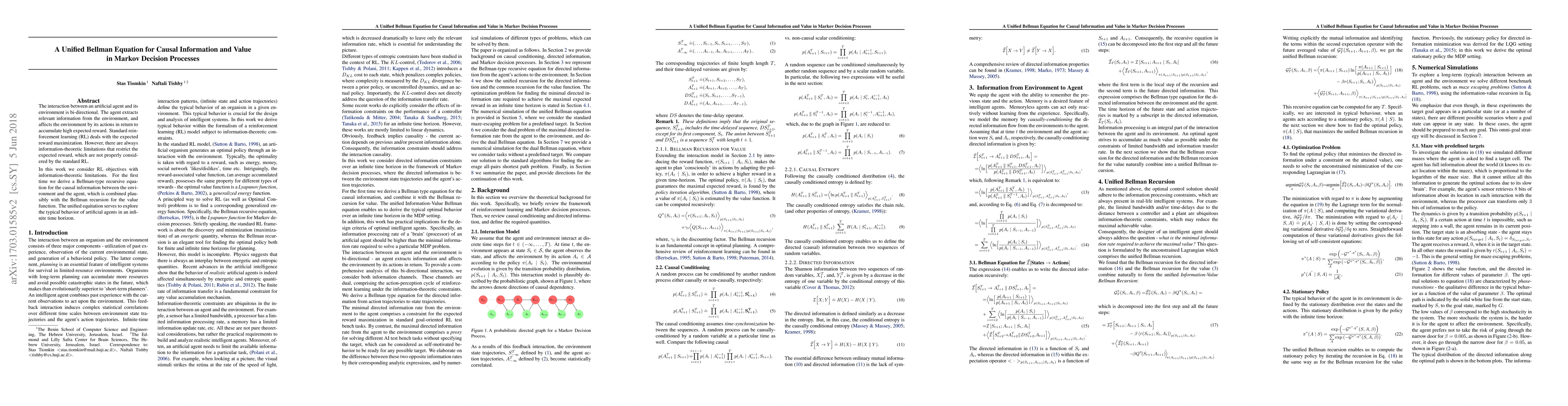 The interaction between an artificial agent and its environment is bi-directional. The agent extracts relevant information from the environment, and affects the environment by its actions in return to accumulate high expected reward. Standard reinforcement learning (RL) deals with the expected reward maximization. However, there are always information-theoretic limitations that restrict the expected reward, which are not properly considered by the standard RL. In this work we consider RL objectives with information-theoretic limitations. For the first time we derive a Bellman-type recursive equa- tion for the causal information between the environment and the agent, which is combined plausibly with the Bellman recursion for the value function. The unified equitation serves to explore the typical behavior of artificial agents in an infinite time horizon.