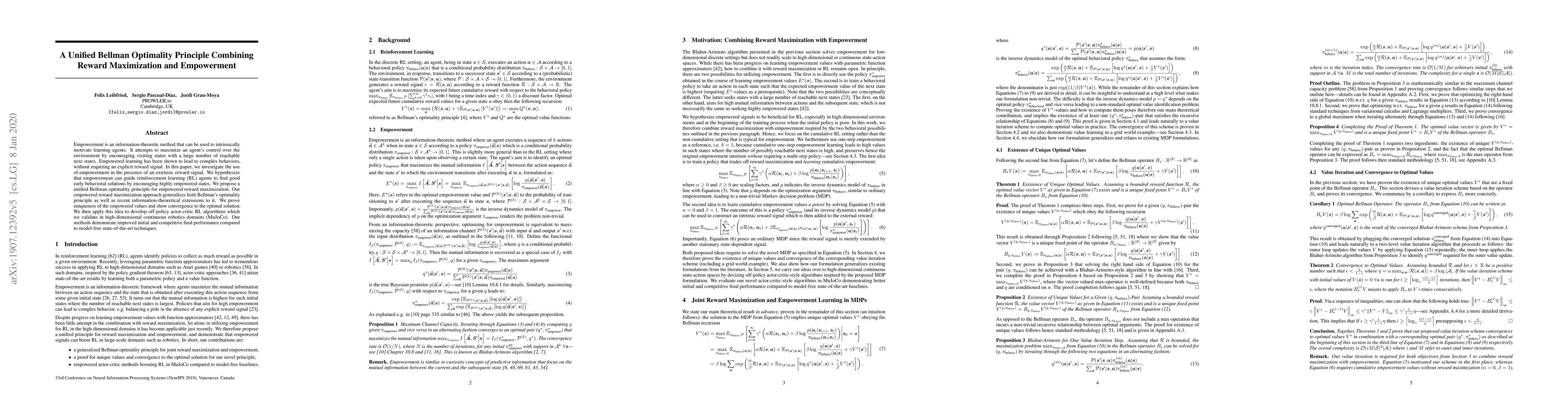 This paper proposes a unified Bellman optimality principle that integrates empowerment with reward maximization in reinforcement learning, showing improved initial performance and competitive final results in high-dimensional robotics tasks. The approach generalizes traditional Bellman optimality and proves convergence to the optimal solution.