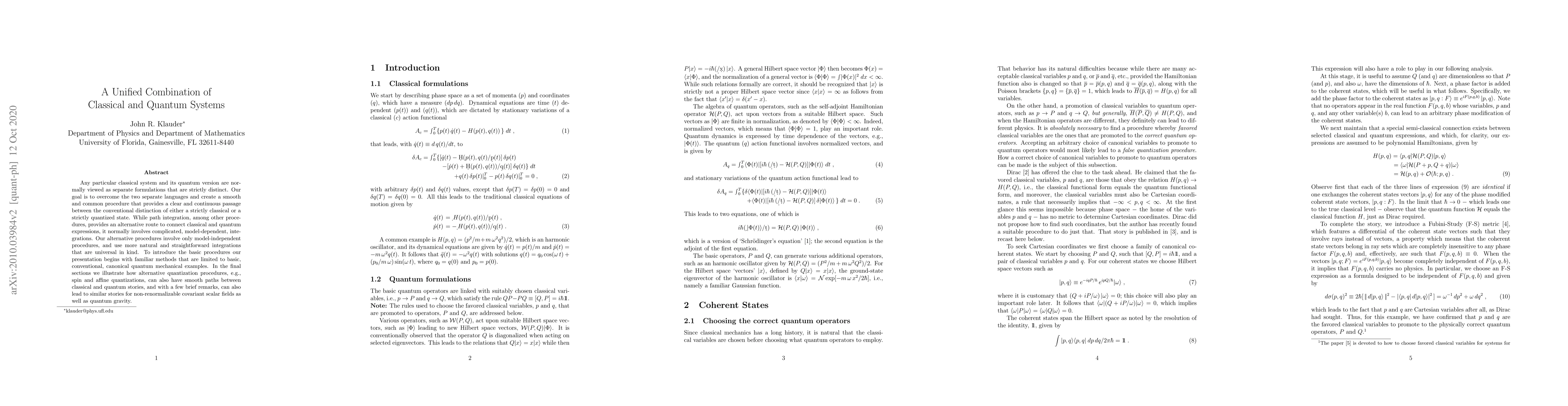 Any particular classical system and its quantum version are normally viewed as separate formulations that are strictly distinct. Our goal is to overcome the two separate languages and create a smooth and common procedure that provides a clear and continuous passage between the conventional distinction of either a strictly classical or a strictly quantized state. While path integration, among other procedures, provides an alternative route to connect classical and quantum expressions, it normally involves complicated, model-dependent, integrations. Our alternative procedures involve only model-independent procedures, and use more natural and straightforward integrations that are universal in kind. To introduce the basic procedures our presentation begins with familiar methods that are limited to basic, conventional, canonical quantum mechanical examples. In the final sections we illustrate how alternative quantization procedures, e.g., spin and affine quantizations, can also have smooth paths between classical and quantum stories, and with a few brief remarks, can also lead to similar stories for non-renormalizable covariant scalar fields as well as quantum gravity.