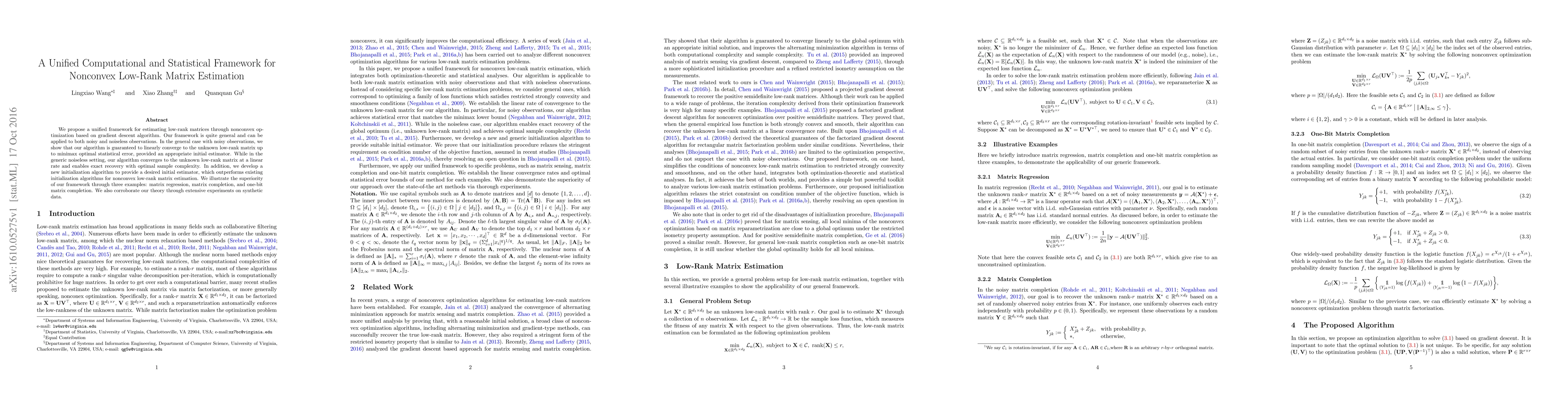 This paper introduces a unified computational and statistical framework for nonconvex low-rank matrix estimation using gradient descent. The proposed algorithm guarantees linear convergence to the true low-rank matrix under both noisy and noiseless conditions, with optimal statistical error and sample complexity.