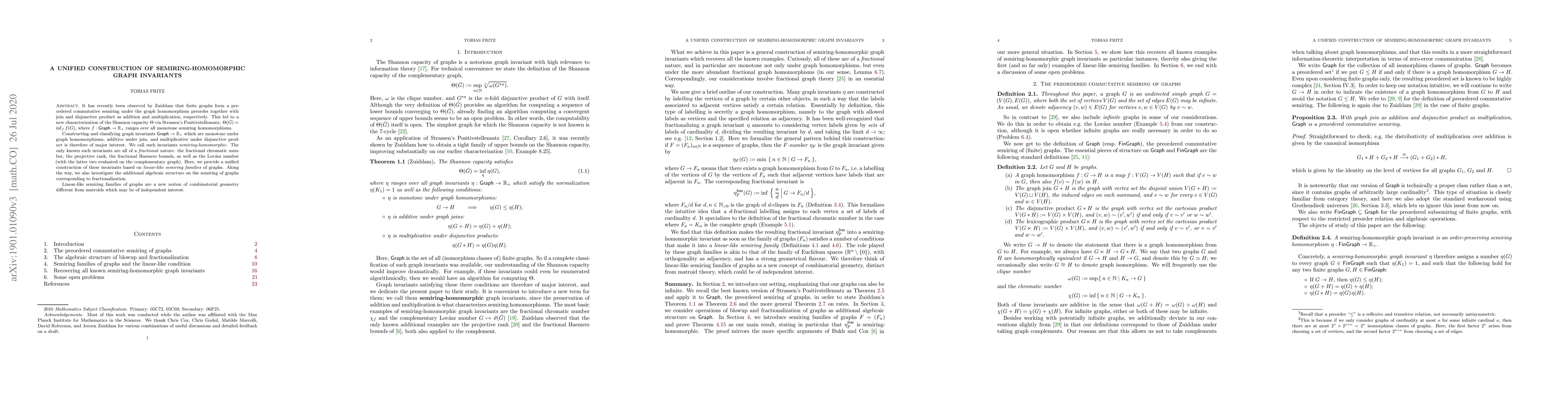 This paper introduces a unified construction of semiring-homomorphic graph invariants, which are monotone under graph homomorphisms and add/multiply under specific operations, providing a new characterization of the Shannon capacity θ.