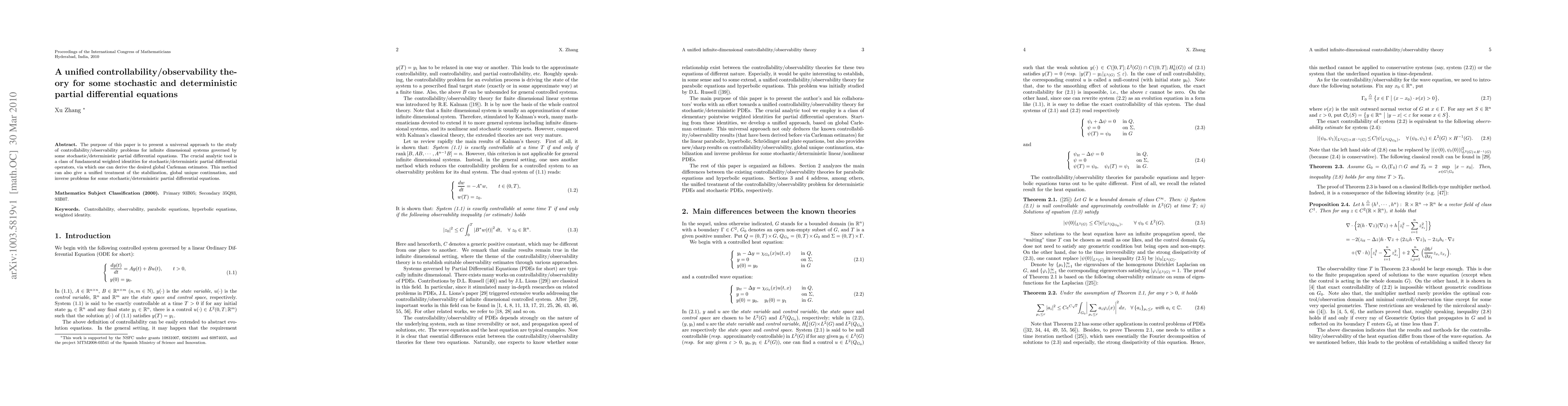 This paper introduces a unified approach to controllability/observability for infinite-dimensional systems described by stochastic/deterministic partial differential equations, leveraging fundamental weighted identities and global Carleman estimates for effective stabilization and unique continuation.
