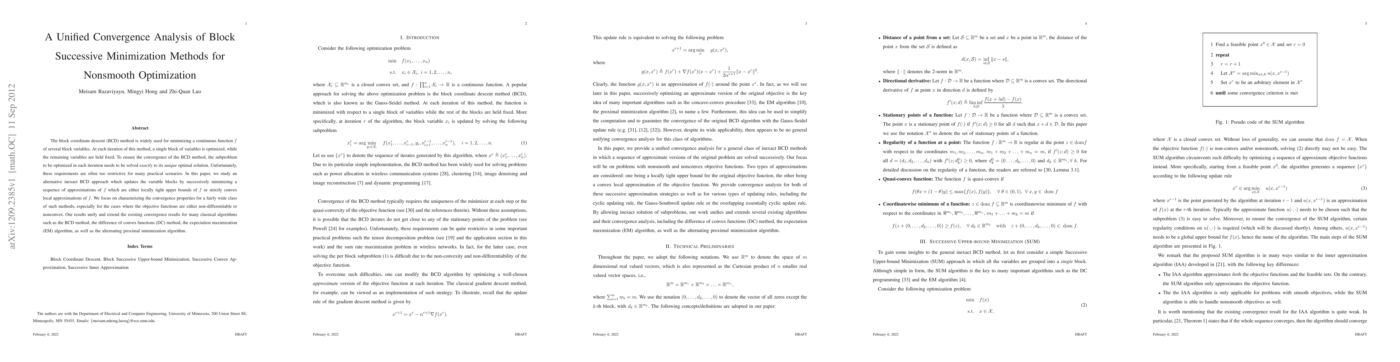 The block coordinate descent (BCD) method is widely used for minimizing a continuous function f of several block variables. At each iteration of this method, a single block of variables is optimized, while the remaining variables are held fixed. To ensure the convergence of the BCD method, the subproblem to be optimized in each iteration needs to be solved exactly to its unique optimal solution. Unfortunately, these requirements are often too restrictive for many practical scenarios. In this paper, we study an alternative inexact BCD approach which updates the variable blocks by successively minimizing a sequence of approximations of f which are either locally tight upper bounds of f or strictly convex local approximations of f. We focus on characterizing the convergence properties for a fairly wide class of such methods, especially for the cases where the objective functions are either non-differentiable or nonconvex. Our results unify and extend the existing convergence results for many classical algorithms such as the BCD method, the difference of convex functions (DC) method, the expectation maximization (EM) algorithm, as well as the alternating proximal minimization algorithm.
