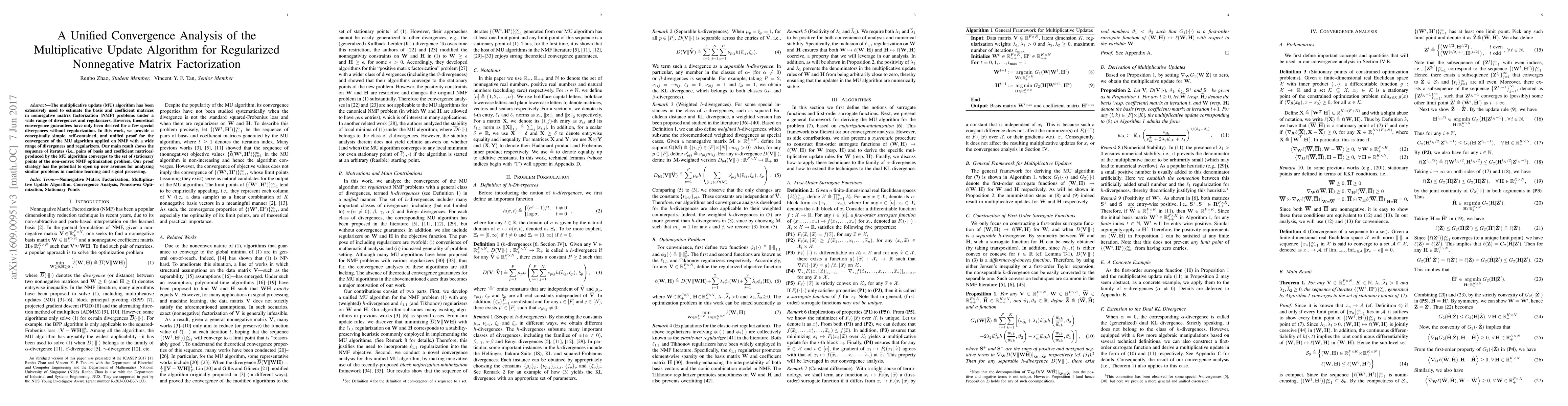 This paper presents a unified convergence analysis for the multiplicative update algorithm in regularized nonnegative matrix factorization, providing a simple proof that the algorithm converges to stationary points under various divergences and regularizers. The proof strategy may facilitate further analysis in machine learning and signal processing.