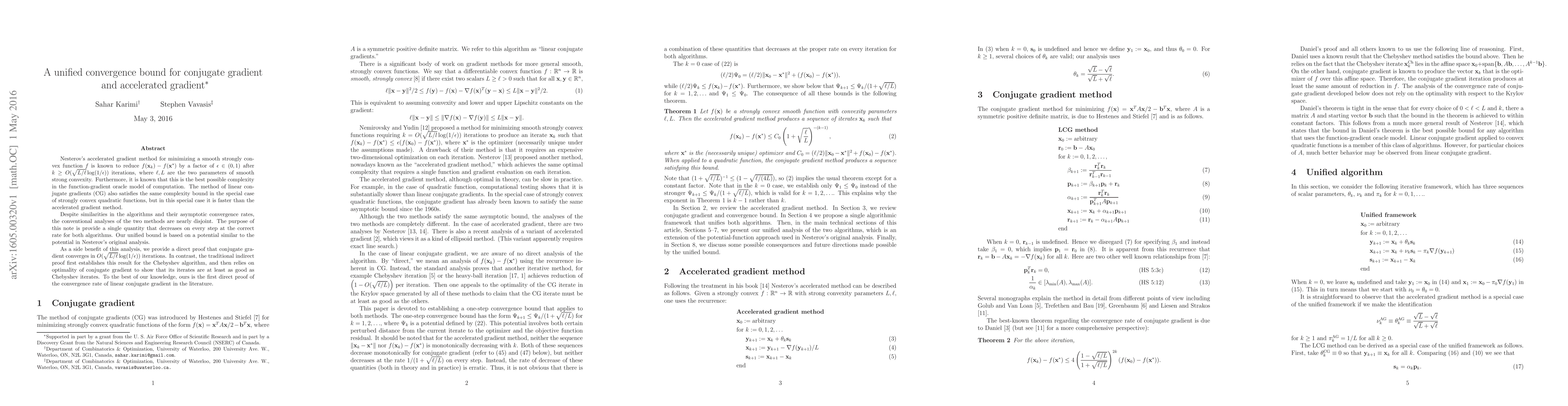 This paper provides a unified convergence bound for both Nesterov's accelerated gradient method and the linear conjugate gradient (CG) method, showing they achieve the same complexity bound for minimizing smooth strongly convex functions. It offers a direct proof for the convergence rate of CG, contrasting with traditional indirect proofs.