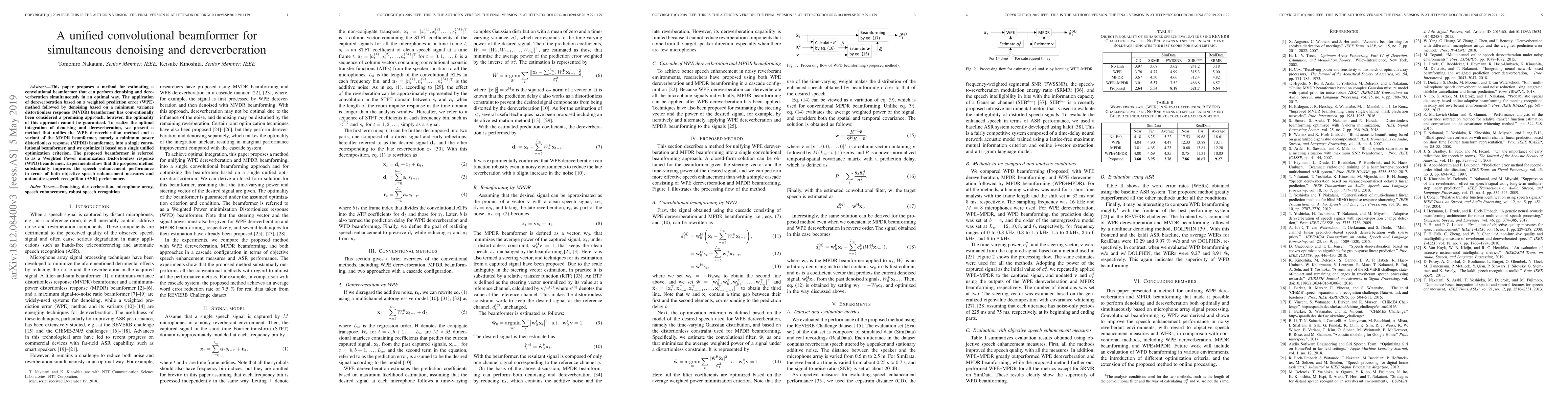 This paper introduces a unified convolutional beamformer, called the Weighted Power minimization Distortionless response (WPD) beamformer, that optimally integrates denoising and dereverberation. The method outperforms conventional approaches by optimizing both processes under a single criterion, leading to significant improvements in speech enhancement and ASR performance.