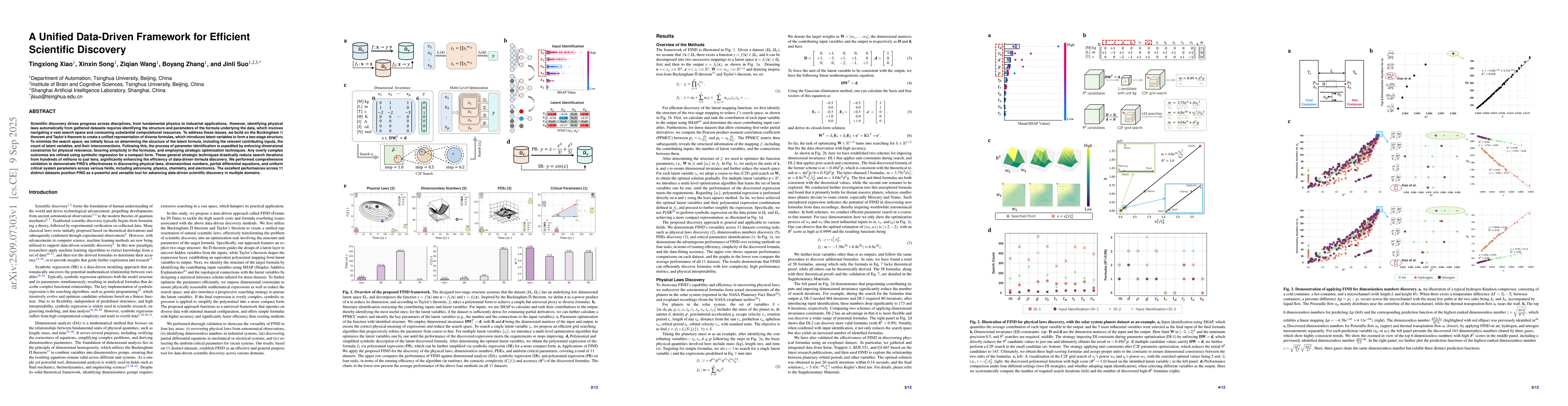 Scientific discovery drives progress across disciplines, from fundamental physics to industrial applications. However, identifying physical laws automatically from gathered datasets requires identifying the structure and parameters of the formula underlying the data, which involves navigating a vast search space and consuming substantial computational resources. To address these issues, we build on the Buckingham $\Pi$ theorem and Taylor's theorem to create a unified representation of diverse formulas, which introduces latent variables to form a two-stage structure. To minimize the search space, we initially focus on determining the structure of the latent formula, including the relevant contributing inputs, the count of latent variables, and their interconnections. Following this, the process of parameter identification is expedited by enforcing dimensional constraints for physical relevance, favoring simplicity in the formulas, and employing strategic optimization techniques. Any overly complex outcomes are refined using symbolic regression for a compact form. These general strategic techniques drastically reduce search iterations from hundreds of millions to just tens, significantly enhancing the efficiency of data-driven formula discovery. We performed comprehensive validation to demonstrate FIND's effectiveness in discovering physical laws, dimensionless numbers, partial differential equations, and uniform critical system parameters across various fields, including astronomy, physics, chemistry, and electronics. The excellent performances across 11 distinct datasets position FIND as a powerful and versatile tool for advancing data-driven scientific discovery in multiple domains.