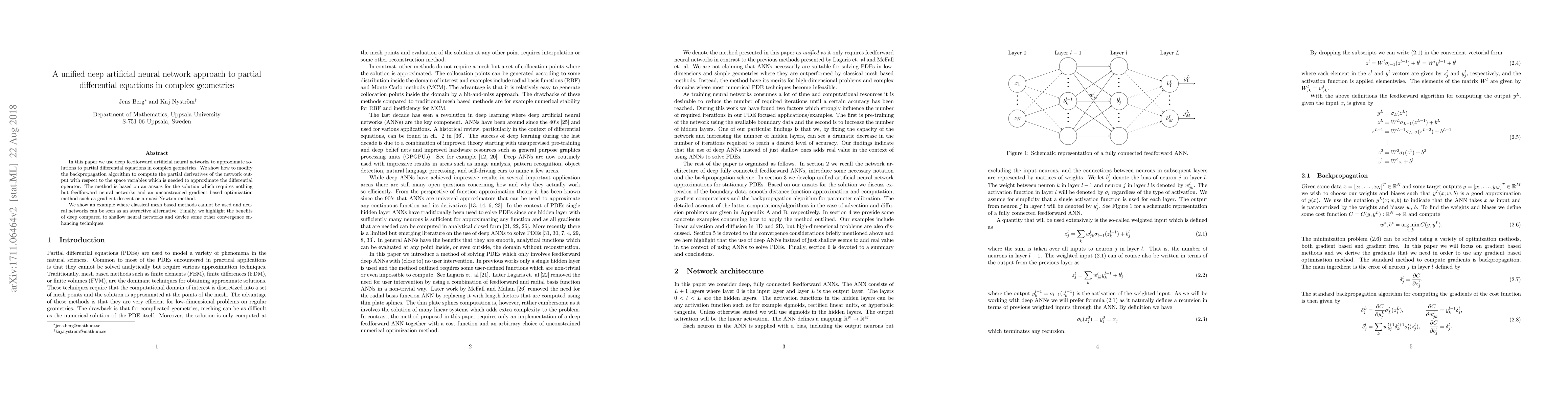 This paper proposes a deep neural network approach to solve partial differential equations in complex geometries, modifying the backpropagation algorithm to compute necessary partial derivatives. The method leverages feedforward neural networks and gradient-based optimization, demonstrating its effectiveness where traditional mesh-based methods fail.