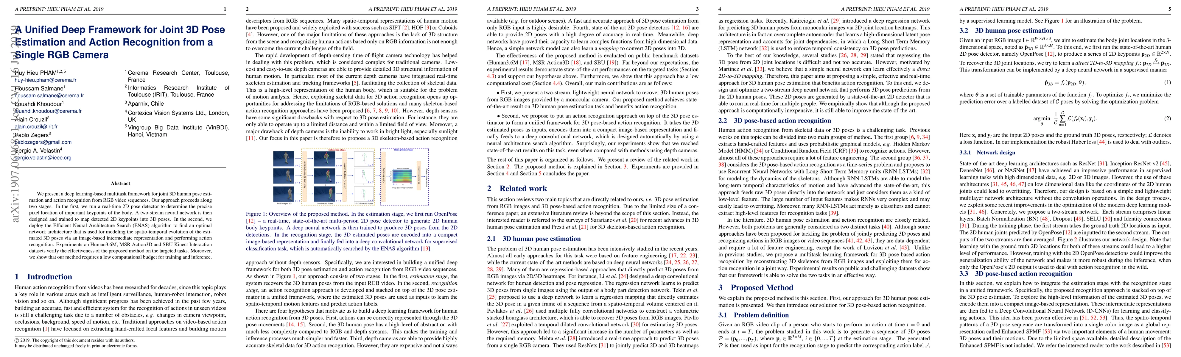 This paper proposes a deep learning framework for simultaneous 3D human pose estimation and action recognition using a single RGB camera. It employs a two-stage approach: first, a 2D pose detector identifies keypoints, followed by a two-stream neural network for 3D pose mapping, and then uses Efficient Neural Architecture Search for optimal network architecture to model pose evolution and recognize actions.
