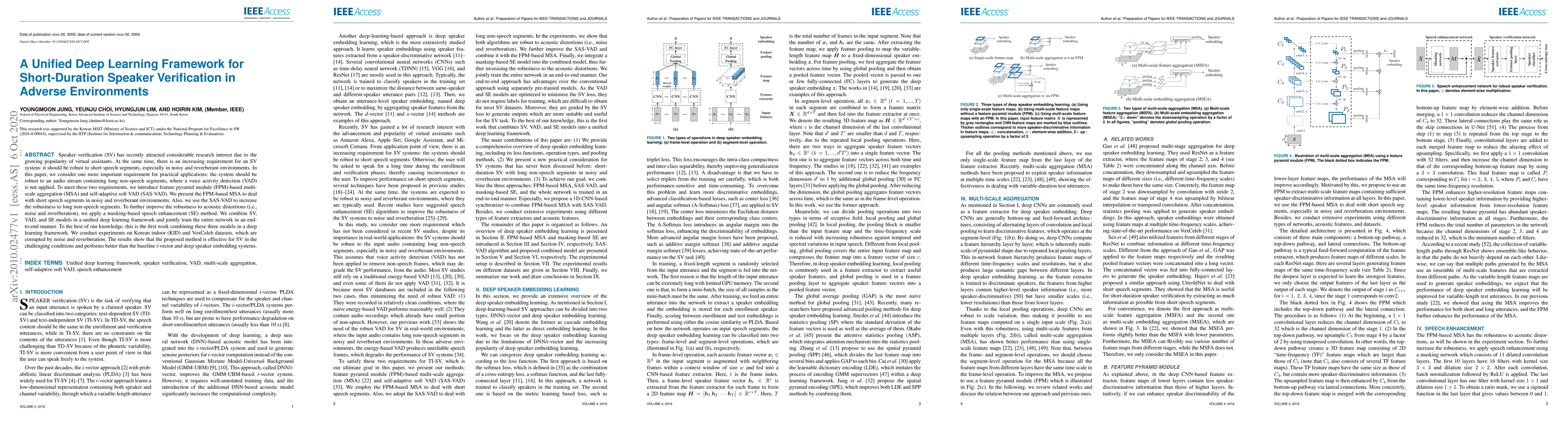 Speaker verification (SV) has recently attracted considerable research interest due to the growing popularity of virtual assistants. At the same time, there is an increasing requirement for an SV system: it should be robust to short speech segments, especially in noisy and reverberant environments. In this paper, we consider one more important requirement for practical applications: the system should be robust to an audio stream containing long non-speech segments, where a voice activity detection (VAD) is not applied. To meet these two requirements, we introduce feature pyramid module (FPM)-based multi-scale aggregation (MSA) and self-adaptive soft VAD (SAS-VAD). We present the FPM-based MSA to deal with short speech segments in noisy and reverberant environments. Also, we use the SAS-VAD to increase the robustness to long non-speech segments. To further improve the robustness to acoustic distortions (i.e., noise and reverberation), we apply a masking-based speech enhancement (SE) method. We combine SV, VAD, and SE models in a unified deep learning framework and jointly train the entire network in an end-to-end manner. To the best of our knowledge, this is the first work combining these three models in a deep learning framework. We conduct experiments on Korean indoor (KID) and VoxCeleb datasets, which are corrupted by noise and reverberation. The results show that the proposed method is effective for SV in the challenging conditions and performs better than the baseline i-vector and deep speaker embedding systems.
