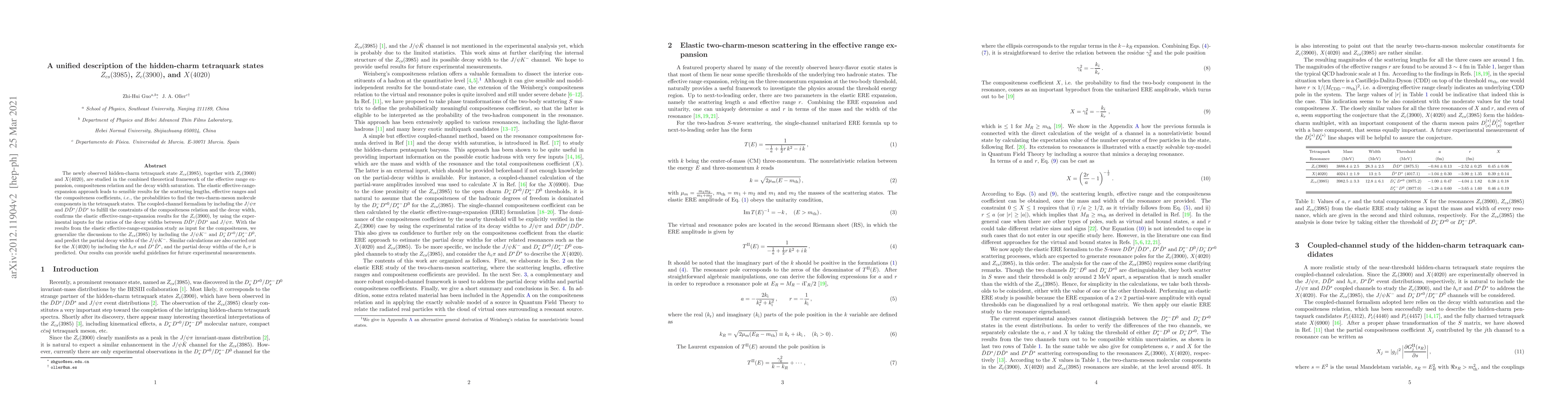 The newly observed hidden-charm tetraquark state $Z_{cs}(3985)$, together with $Z_c(3900)$ and $X(4020)$, are studied in the combined theoretical framework of the effective range expansion, compositeness relation and the decay width saturation. The elastic effective-range-expansion approach leads to sensible results for the scattering lengths, effective ranges and the compositeness coefficients, $i.e.$, the probabilities to find the two-charm-meson molecule components in the tetraquark states. The coupled-channel formalism by including the $J/\psi\pi$ and $D\bar{D}^*/\bar{D}D^*$ to fulfill the constraints of the compositeness relation and the decay width, confirms the elastic effective-range-expansion results for the $Z_c(3900)$, by using the experimental inputs for the ratios of the decay widths between $D\bar{D}^*/\bar{D}D^*$ and $J/\psi\pi$. With the results from the elastic effective-range-expansion study as input for the compositeness, we generalize the discussions to the $Z_{cs}(3985)$ by including the $J/\psi K^{-}$ and $D_s^{-}D^{*0}/D_s^{*-}D^{0}$, and predict the partial decay widths of the $J/\psi K^{-}$. Similar calculations are also carried out for the $X(4020)$ by including the $h_c\pi$ and $D^*\bar{D}^*$, and the partial decay widths of the $h_c\pi$ is predicted. Our results can provide useful guidelines for future experimental measurements.