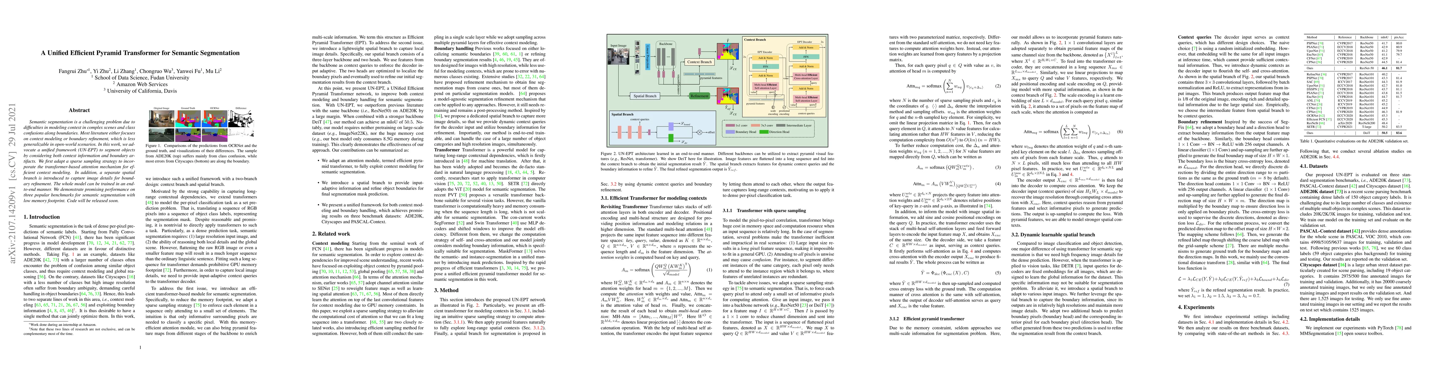 Semantic segmentation is a challenging problem due to difficulties in modeling context in complex scenes and class confusions along boundaries. Most literature either focuses on context modeling or boundary refinement, which is less generalizable in open-world scenarios. In this work, we advocate a unified framework(UN-EPT) to segment objects by considering both context information and boundary artifacts. We first adapt a sparse sampling strategy to incorporate the transformer-based attention mechanism for efficient context modeling. In addition, a separate spatial branch is introduced to capture image details for boundary refinement. The whole model can be trained in an end-to-end manner. We demonstrate promising performance on three popular benchmarks for semantic segmentation with low memory footprint. Code will be released soon.