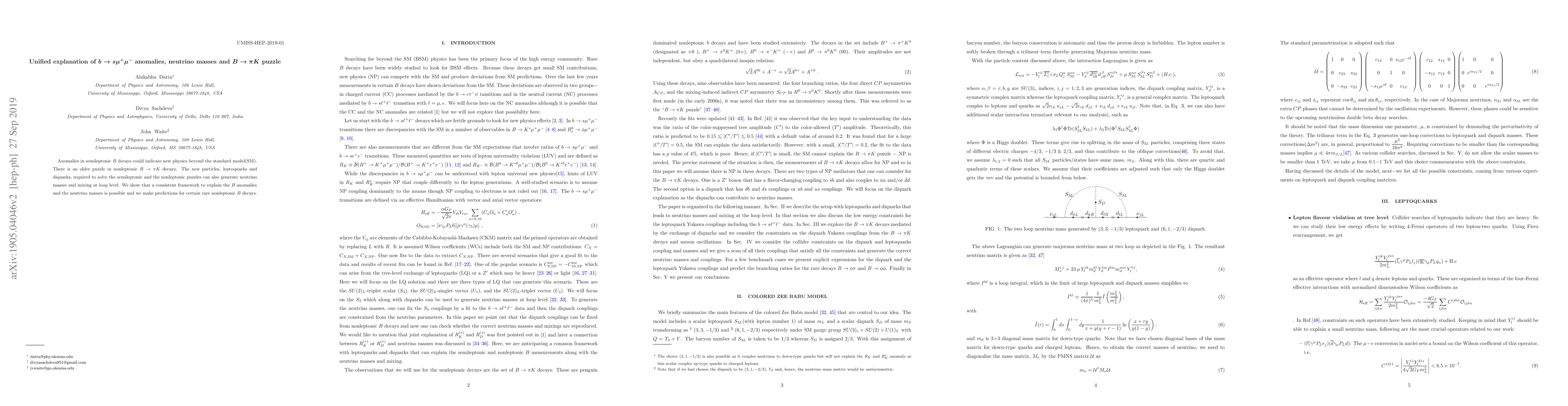 Anomalies in semi-leptonic $B$ decays could indicate new physics beyond the standard model(SM). There is an older puzzle in non-leptonic $B \to \pi K$ decays. The new particles, leptoquarks and diquarks, required to solve the semi-leptonic and the non-leptonic puzzles can also generate neutrino masses and mixing at loop level. We show that a consistent framework to explain the $B$ anomalies and the neutrino masses is possible and we make predictions for certain rare nonleptonic $B$ decays.
