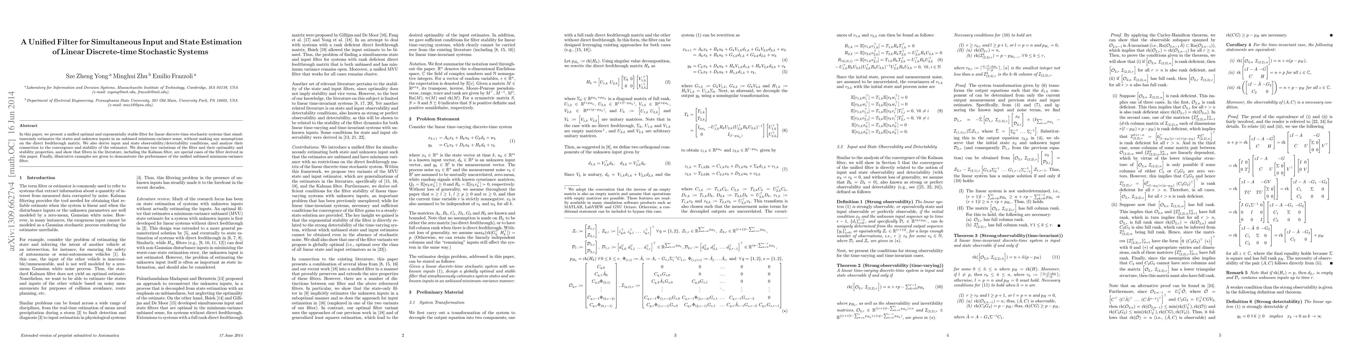 This paper introduces a unified filter for estimating states and unknown inputs in linear discrete-time stochastic systems, achieving unbiased minimum-variance estimation. The filter is shown to be optimal and exponentially stable, with derived observability/detectability conditions linking to estimator convergence and stability.