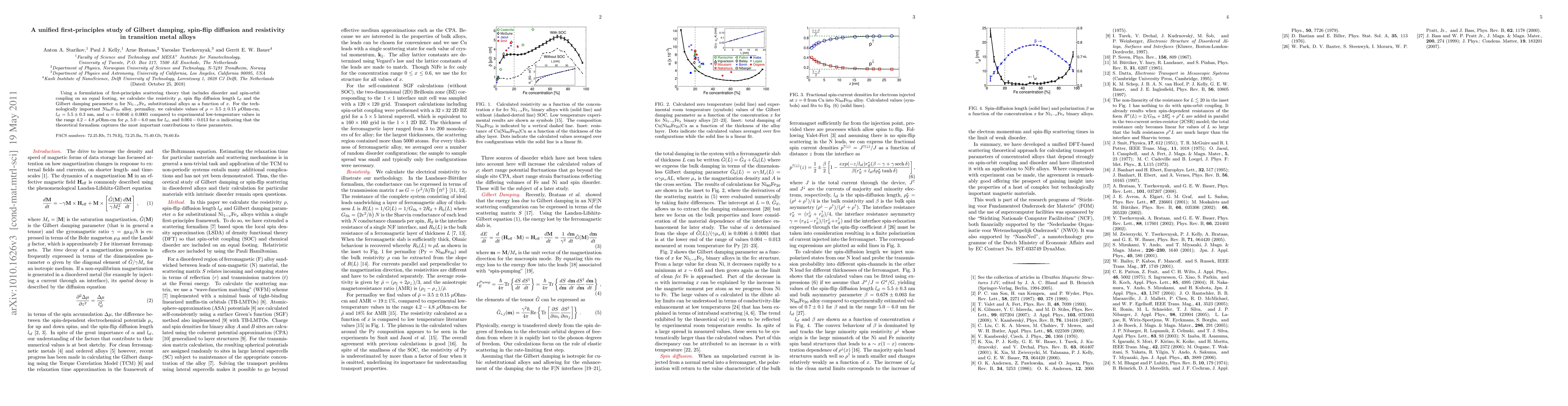 Using a formulation of first-principles scattering theory that includes disorder and spin-orbit coupling on an equal footing, we calculate the resistivity $\rho$, spin flip diffusion length $l_{sf}$ and the Gilbert damping parameter $\alpha$ for Ni$_{1-x}$Fe$_x$ substitutional alloys as a function of $x$. For the technologically important Ni$_{80}$Fe$_{20}$ alloy, permalloy, we calculate values of $\rho = 3.5 \pm 0.15$ $\mu$Ohm-cm, $l_{sf}=5.5 \pm 0.3$ nm, and $\alpha= 0.0046 \pm 0.0001$ compared to experimental low-temperature values in the range $4.2-4.8$ $\mu$Ohm-cm for $\rho$, $5.0-6.0$ nm for $l_{sf}$, and $0.004-0.013$ for $\alpha$ indicating that the theoretical formalism captures the most important contributions to these parameters.
