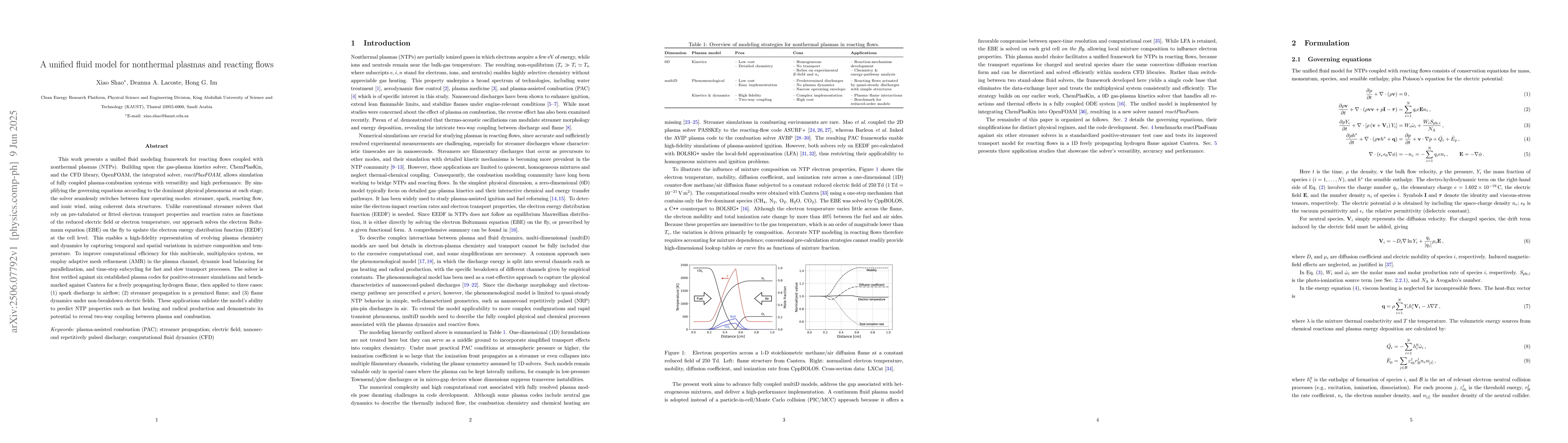 This work presents a unified fluid modeling framework for reacting flows coupled with nonthermal plasmas (NTPs). Building upon the gas-plasma kinetics solver, ChemPlasKin, and the CFD library, OpenFOAM, the integrated solver, reactPlasFOAM, allows simulation of fully coupled plasma-combustion systems with versatility and high performance. By simplifying the governing equations according to the dominant physical phenomena at each stage, the solver seamlessly switches between four operating modes: streamer, spark, reacting flow, and ionic wind, using coherent data structures. Unlike conventional streamer solvers that rely on pre-tabulated or fitted electron transport properties and reaction rates as functions of the reduced electric field or electron temperature, our approach solves the electron Boltzmann equation (EBE) on the fly to update the electron energy distribution function (EEDF) at the cell level. This enables a high-fidelity representation of evolving plasma chemistry and dynamics by capturing temporal and spatial variations in mixture composition and temperature. To improve computational efficiency for this multiscale, multiphysics system, we employ adaptive mesh refinement (AMR) in the plasma channel, dynamic load balancing for parallelization, and time-step subcycling for fast and slow transport processes. The solver is first verified against six established plasma codes for positive-streamer simulations and benchmarked against Cantera for a freely propagating hydrogen flame, then applied to three cases: (1) spark discharge in airflow; (2) streamer propagation in a premixed flame; and (3) flame dynamics under non-breakdown electric fields. These applications validate the model's ability to predict NTP properties such as fast heating and radical production and demonstrate its potential to reveal two-way coupling between plasma and combustion.
