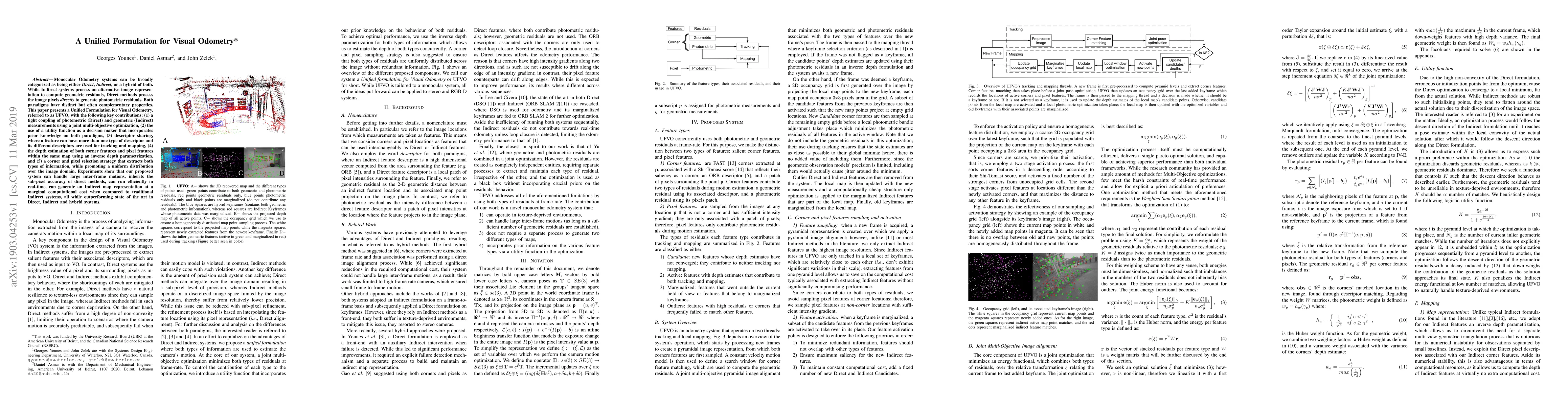 Monocular Odometry systems can be broadly categorized as being either Direct, Indirect, or a hybrid of both. While Indirect systems process an alternative image representation to compute geometric residuals, Direct methods process the image pixels directly to generate photometric residuals. Both paradigms have distinct but often complementary properties. This paper presents a Unified Formulation for Visual Odometry, referred to as UFVO, with the following key contributions: (1) a tight coupling of photometric (Direct) and geometric (Indirect) measurements using a joint multi-objective optimization, (2) the use of a utility function as a decision maker that incorporates prior knowledge on both paradigms, (3) descriptor sharing, where a feature can have more than one type of descriptor and its different descriptors are used for tracking and mapping, (4) the depth estimation of both corner features and pixel features within the same map using an inverse depth parametrization, and (5) a corner and pixel selection strategy that extracts both types of information, while promoting a uniform distribution over the image domain. Experiments show that our proposed system can handle large inter-frame motions, inherits the sub-pixel accuracy of direct methods, can run efficiently in real-time, can generate an Indirect map representation at a marginal computational cost when compared to traditional Indirect systems, all while outperforming state of the art in Direct, Indirect and hybrid systems.