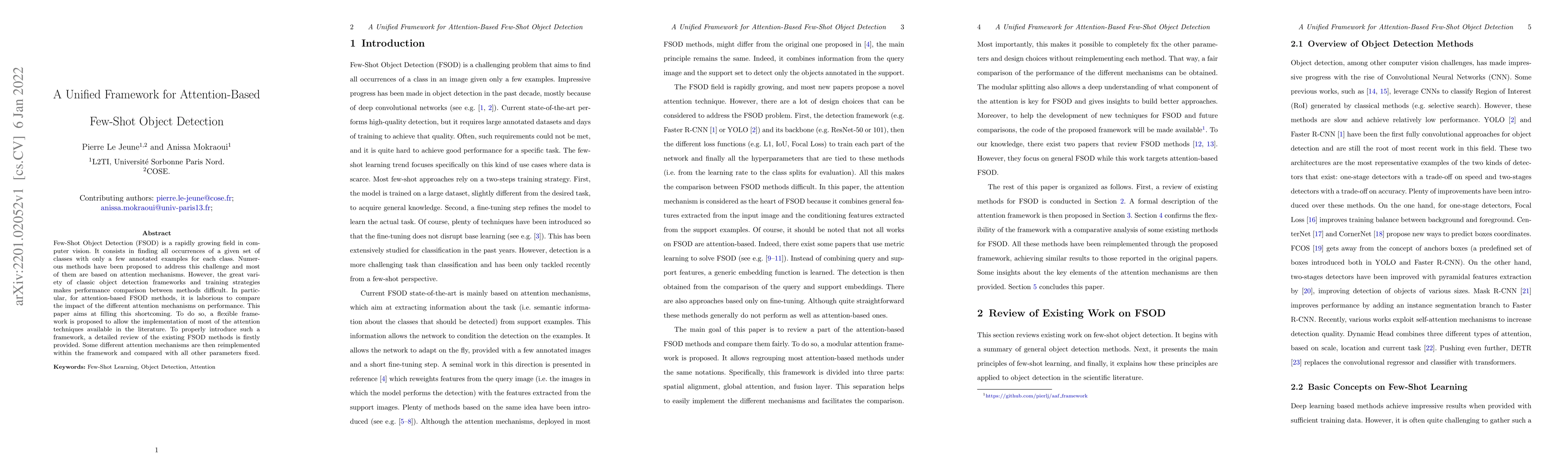 This paper proposes a unified framework for attention-based few-shot object detection, allowing for easy comparison of different attention mechanisms and improving performance in this rapidly growing field of computer vision. The framework provides a flexible implementation of various attention techniques, enabling more accurate performance comparisons and paving the way for further research and innovation.