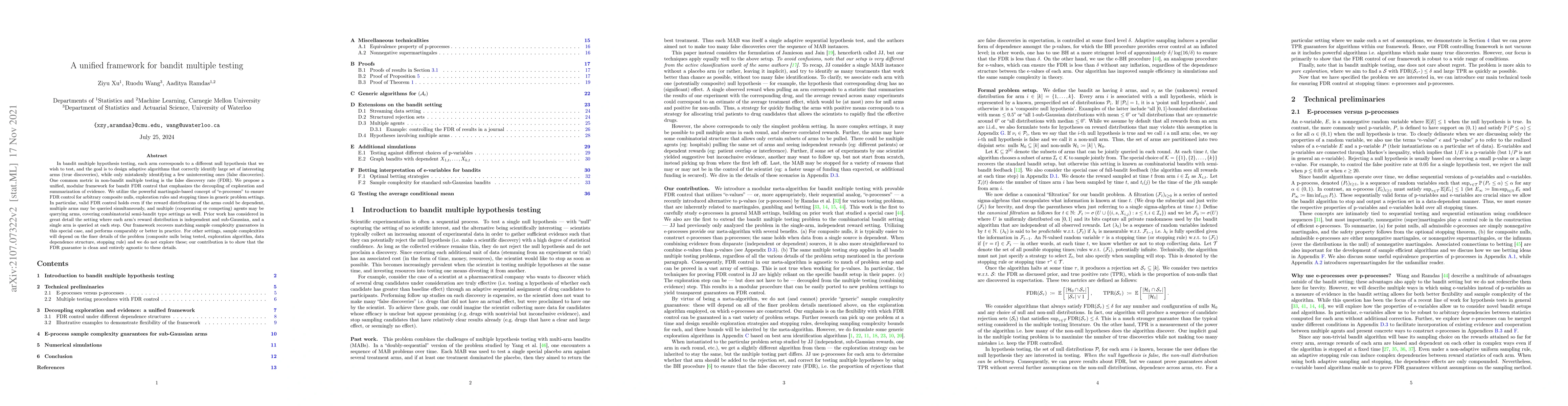 This paper proposes a unified framework for adaptive bandit multiple testing, focusing on controlling the false discovery rate (FDR) while identifying true discoveries. The framework leverages martingale-based "e-processes" to ensure FDR control across various complex settings, including dependent reward distributions, simultaneous arm queries, and multiple agents.
