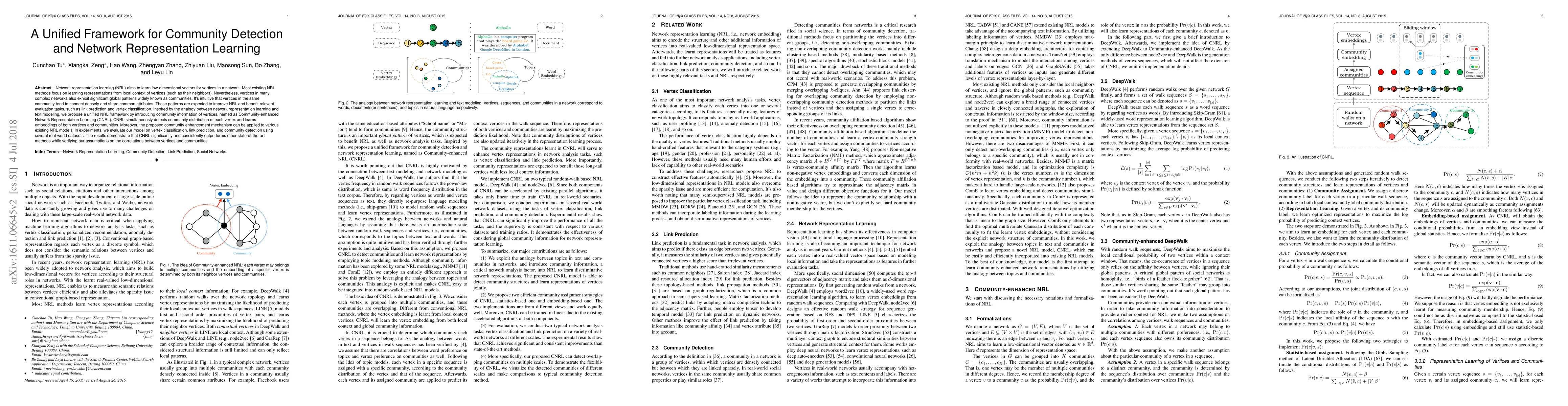 This paper proposes a unified framework called Community-enhanced Network Representation Learning (CNRL) that integrates community detection with network representation learning to improve NRL performance. CNRL detects community structures and enhances vertex embeddings using community information, outperforming other methods in tasks like vertex classification, link prediction, and community detection.