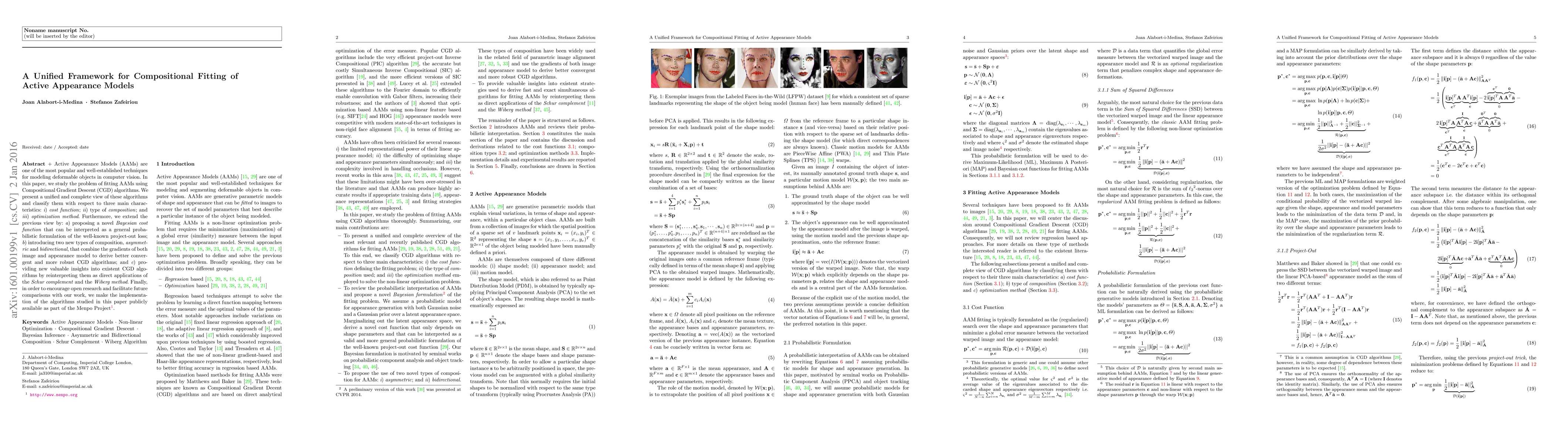This paper presents a comprehensive framework for compositional fitting of Active Appearance Models (AAMs) using Compositional Gradient Descent (CGD) algorithms, classifying them based on cost function, composition type, and optimization method. It introduces novel Bayesian cost functions, new asymmetric and bidirectional compositions, and reinterprets existing algorithms using the Schur complement and Wiberg method, all to enhance the robustness and convergence of CGD algorithms.