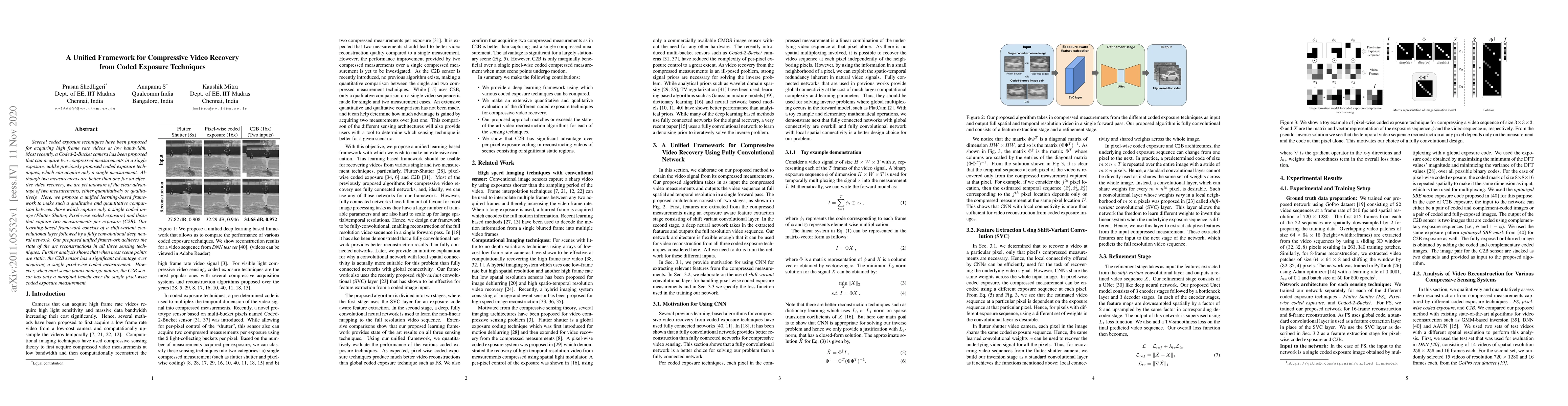 Several coded exposure techniques have been proposed for acquiring high frame rate videos at low bandwidth. Most recently, a Coded-2-Bucket camera has been proposed that can acquire two compressed measurements in a single exposure, unlike previously proposed coded exposure techniques, which can acquire only a single measurement. Although two measurements are better than one for an effective video recovery, we are yet unaware of the clear advantage of two measurements, either quantitatively or qualitatively. Here, we propose a unified learning-based framework to make such a qualitative and quantitative comparison between those which capture only a single coded image (Flutter Shutter, Pixel-wise coded exposure) and those that capture two measurements per exposure (C2B). Our learning-based framework consists of a shift-variant convolutional layer followed by a fully convolutional deep neural network. Our proposed unified framework achieves the state of the art reconstructions in all three sensing techniques. Further analysis shows that when most scene points are static, the C2B sensor has a significant advantage over acquiring a single pixel-wise coded measurement. However, when most scene points undergo motion, the C2B sensor has only a marginal benefit over the single pixel-wise coded exposure measurement.
