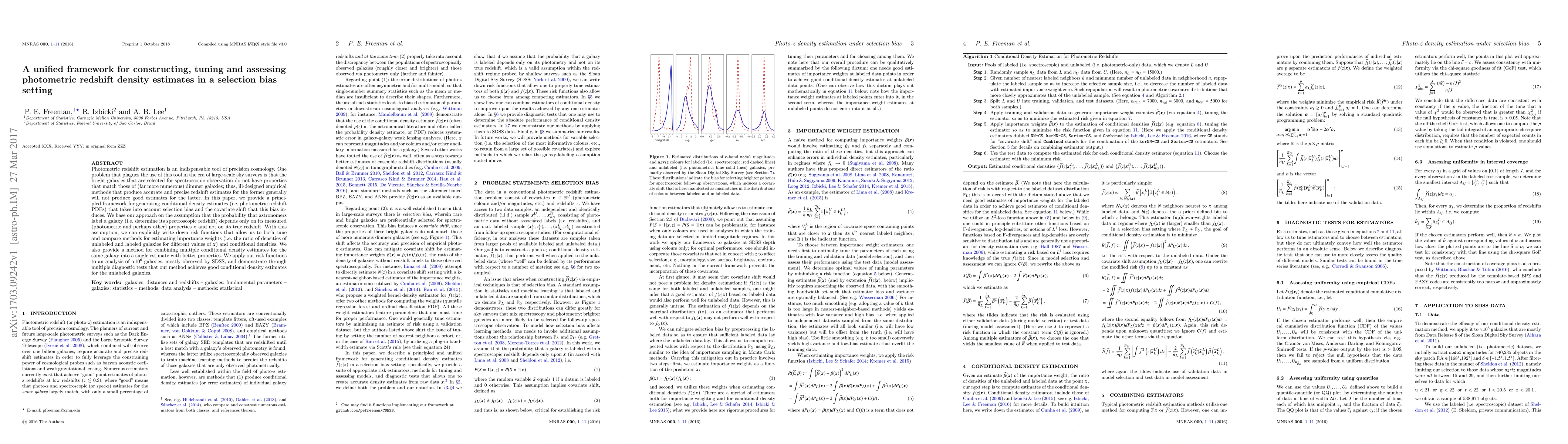 Photometric redshift estimation is an indispensable tool of precision cosmology. One problem that plagues the use of this tool in the era of large-scale sky surveys is that the bright galaxies that are selected for spectroscopic observation do not have properties that match those of (far more numerous) dimmer galaxies; thus, ill-designed empirical methods that produce accurate and precise redshift estimates for the former generally will not produce good estimates for the latter. In this paper, we provide a principled framework for generating conditional density estimates (i.e. photometric redshift PDFs) that takes into account selection bias and the covariate shift that this bias induces. We base our approach on the assumption that the probability that astronomers label a galaxy (i.e. determine its spectroscopic redshift) depends only on its measured (photometric and perhaps other) properties x and not on its true redshift. With this assumption, we can explicitly write down risk functions that allow us to both tune and compare methods for estimating importance weights (i.e. the ratio of densities of unlabeled and labeled galaxies for different values of x) and conditional densities. We also provide a method for combining multiple conditional density estimates for the same galaxy into a single estimate with better properties. We apply our risk functions to an analysis of approximately one million galaxies, mostly observed by SDSS, and demonstrate through multiple diagnostic tests that our method achieves good conditional density estimates for the unlabeled galaxies.