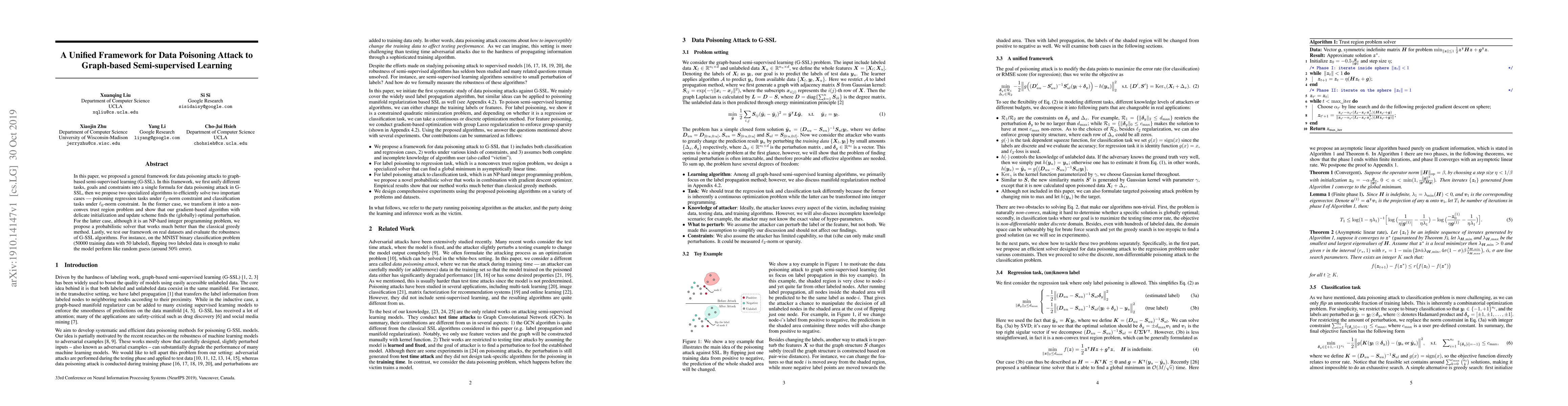 In this paper, we proposed a general framework for data poisoning attacks to graph-based semi-supervised learning (G-SSL). In this framework, we first unify different tasks, goals, and constraints into a single formula for data poisoning attack in G-SSL, then we propose two specialized algorithms to efficiently solve two important cases --- poisoning regression tasks under $\ell_2$-norm constraint and classification tasks under $\ell_0$-norm constraint. In the former case, we transform it into a non-convex trust region problem and show that our gradient-based algorithm with delicate initialization and update scheme finds the (globally) optimal perturbation. For the latter case, although it is an NP-hard integer programming problem, we propose a probabilistic solver that works much better than the classical greedy method. Lastly, we test our framework on real datasets and evaluate the robustness of G-SSL algorithms. For instance, on the MNIST binary classification problem (50000 training data with 50 labeled), flipping two labeled data is enough to make the model perform like random guess (around 50\% error).