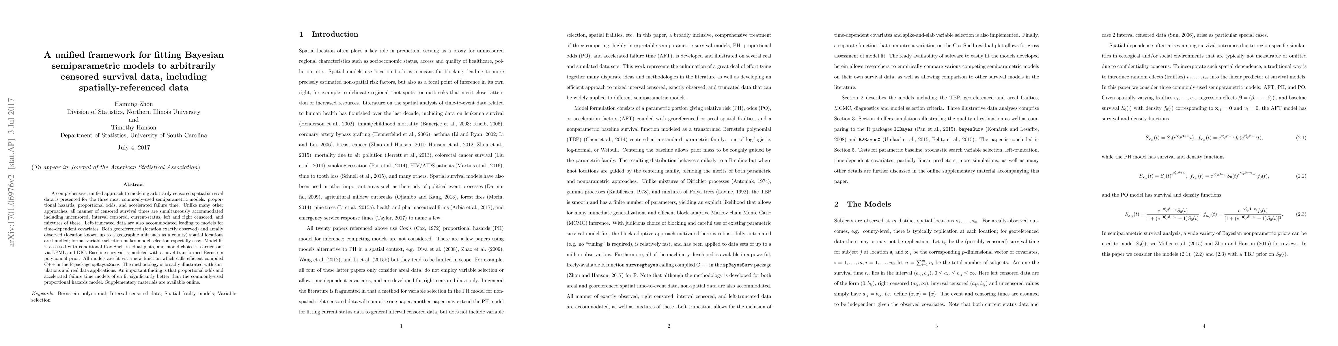 This paper introduces a unified framework for fitting Bayesian semiparametric models to arbitrarily censored spatial survival data, accommodating various censored types and left-truncated data. It utilizes proportional hazards, proportional odds, and accelerated failure time models, and is implemented in the R package spBaysSurv with efficient C++ code.
