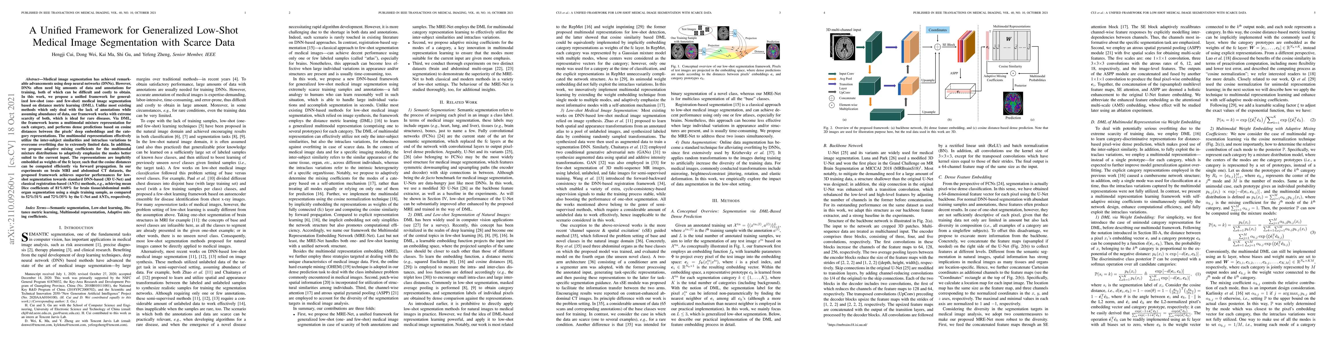 This paper proposes a unified framework for generalized low-shot medical image segmentation using distance metric learning to address the scarcity of both data and annotations. The framework leverages multimodal mixture representations and adaptive mixing coefficients to effectively utilize inter-subject similarities and overcome overfitting, achieving superior segmentation performance on brain MRI and abdominal CT datasets compared to standard DNN and registration-based methods.