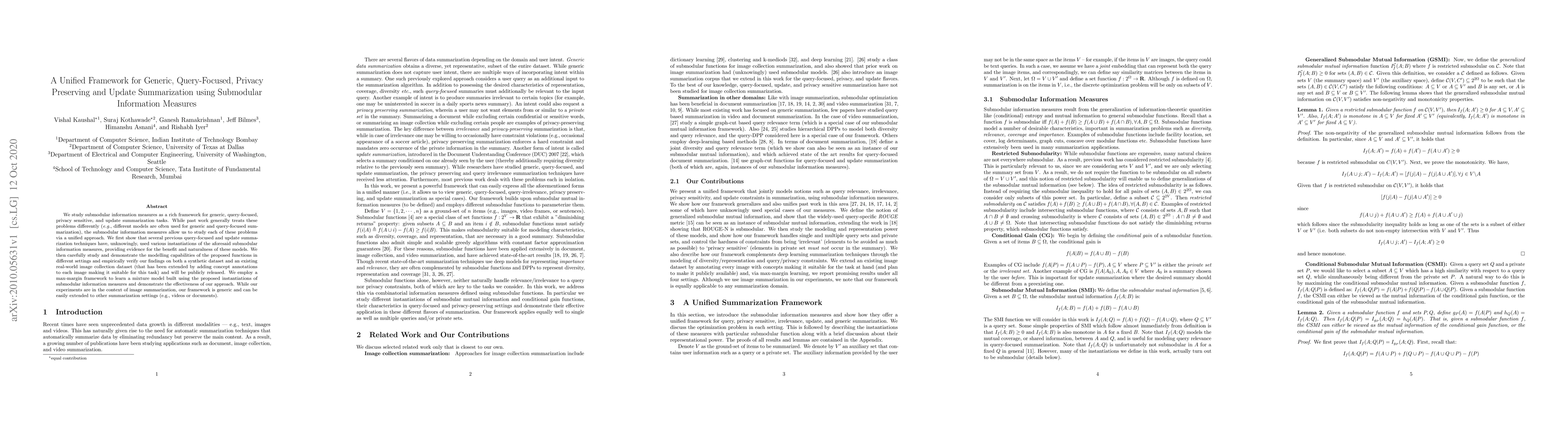 This paper proposes a unified framework for various summarization tasks using submodular information measures, demonstrating that these measures can naturally address generic, query-focused, privacy-preserving, and update summarization. The authors show the effectiveness of their approach through empirical validation on both synthetic and real-world image datasets.