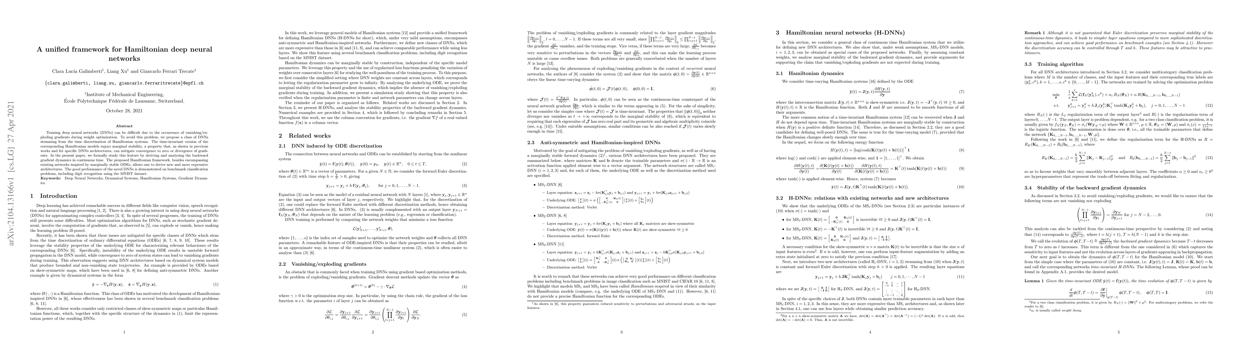 This paper proposes a unified framework for Hamiltonian deep neural networks to address the issue of vanishing/exploding gradients. It leverages the time discretization of Hamiltonian systems to develop marginally stable models, which mitigate gradient convergence issues, and demonstrates improved performance on classification tasks.