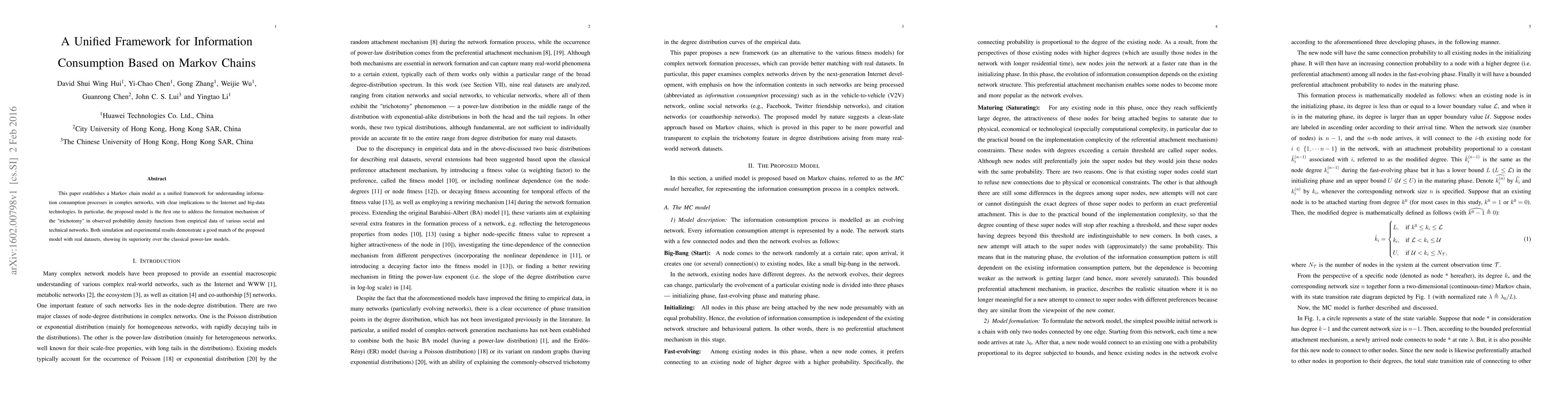 This paper introduces a Markov chain model for analyzing information consumption in complex networks, demonstrating its ability to explain the "trichotomy" in empirical data and outperforming classical power-law models through simulations and experiments.