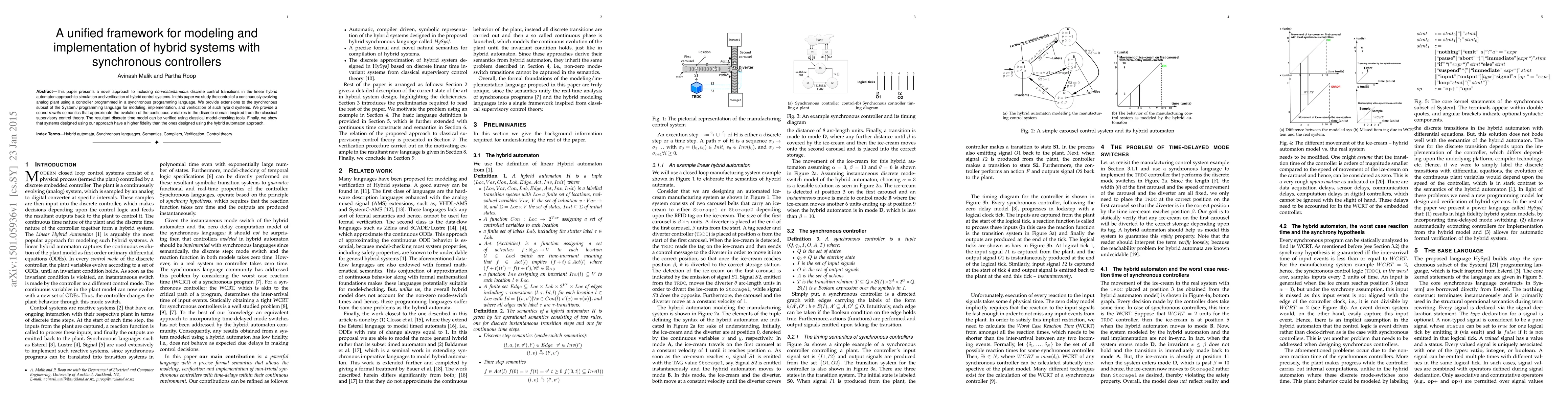 This paper introduces a unified framework for modeling and implementing hybrid systems with synchronous controllers, extending the linear hybrid automaton approach to include non-instantaneous discrete control transitions. It provides enhancements to the SystemJ programming language for hybrid system modeling and verification, offering a sound rewrite semantics for continuous variable approximation and demonstrating higher fidelity in system design compared to traditional hybrid automaton methods.