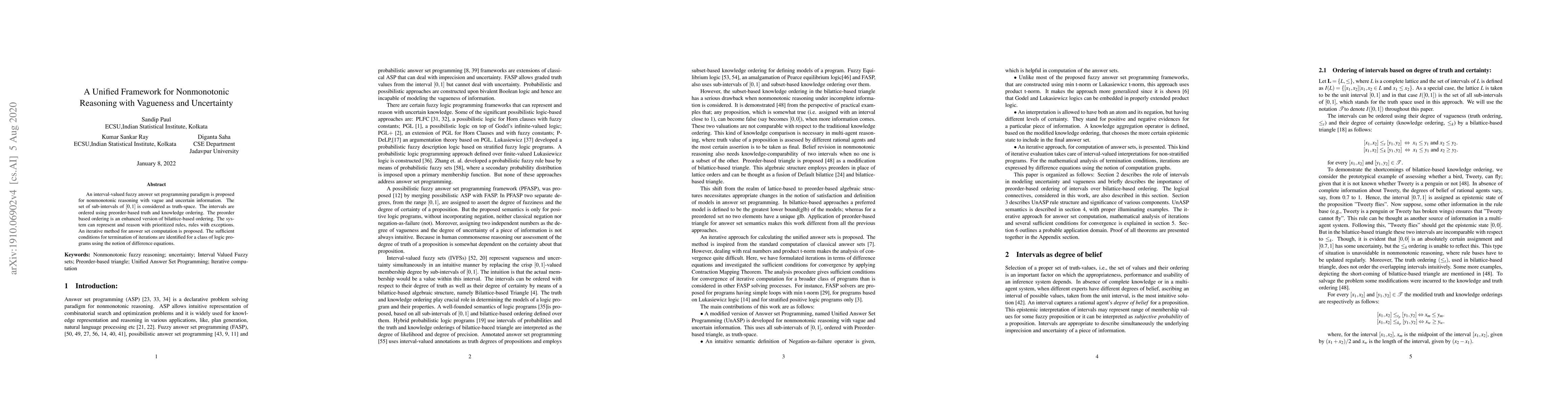 An interval-valued fuzzy answer set programming paradigm is proposed for nonmonotonic reasoning with vague and uncertain information. The set of sub-intervals of $[0,1]$ is considered as truth-space. The intervals are ordered using preorder-based truth and knowledge ordering. The preorder based ordering is an enhanced version of bilattice-based ordering. The system can represent and reason with prioritized rules, rules with exceptions. An iterative method for answer set computation is proposed. The sufficient conditions for termination of iterations are identified for a class of logic programs using the notion of difference equations.