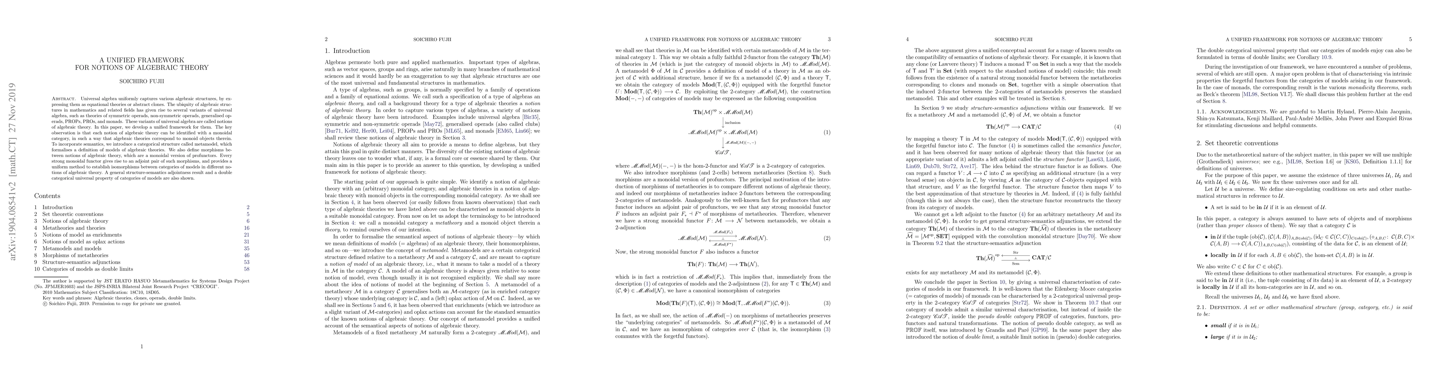 Universal algebra uniformly captures various algebraic structures, by expressing them as equational theories or abstract clones. The ubiquity of algebraic structures in mathematics and related fields has given rise to several variants of universal algebra, such as theories of symmetric operads, non-symmetric operads, generalised operads, PROPs, PROs, and monads. These variants of universal algebra are called notions of algebraic theory. In this paper, we develop a unified framework for them. The key observation is that each notion of algebraic theory can be identified with a monoidal category, in such a way that algebraic theories correspond to monoid objects therein. To incorporate semantics, we introduce a categorical structure called metamodel, which formalises a definition of models of algebraic theories. We also define morphisms between notions of algebraic theory, which are a monoidal version of profunctors. Every strong monoidal functor gives rise to an adjoint pair of such morphisms, and provides a uniform method to establish isomorphisms between categories of models in different notions of algebraic theory. A general structure-semantics adjointness result and a double categorical universal property of categories of models are also shown.