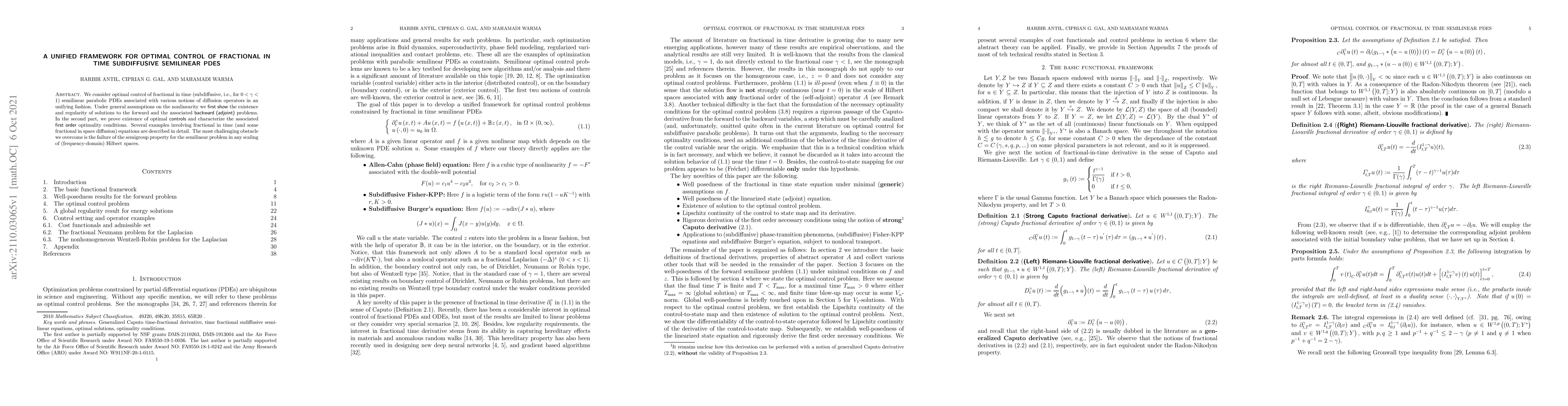 This paper develops a unified framework for optimal control of fractional in time subdiffusive semilinear PDEs, proving the existence and regularity of solutions to both forward and adjoint problems. It also establishes the existence of optimal controls and characterizes the first-order optimality conditions, addressing the challenge of the semigroup property failure in semilinear problems.