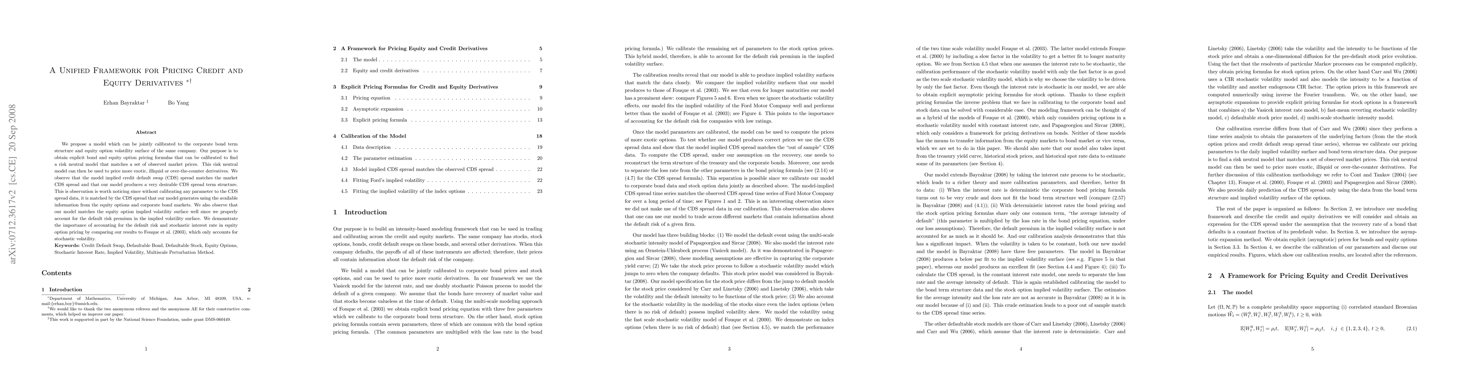 This paper proposes a unified model for pricing both credit and equity derivatives, jointly calibrated to corporate bond term structures and equity option volatility surfaces. The model accurately matches market CDS spreads and equity option implied volatility, emphasizing the importance of default risk and stochastic interest rates in pricing.