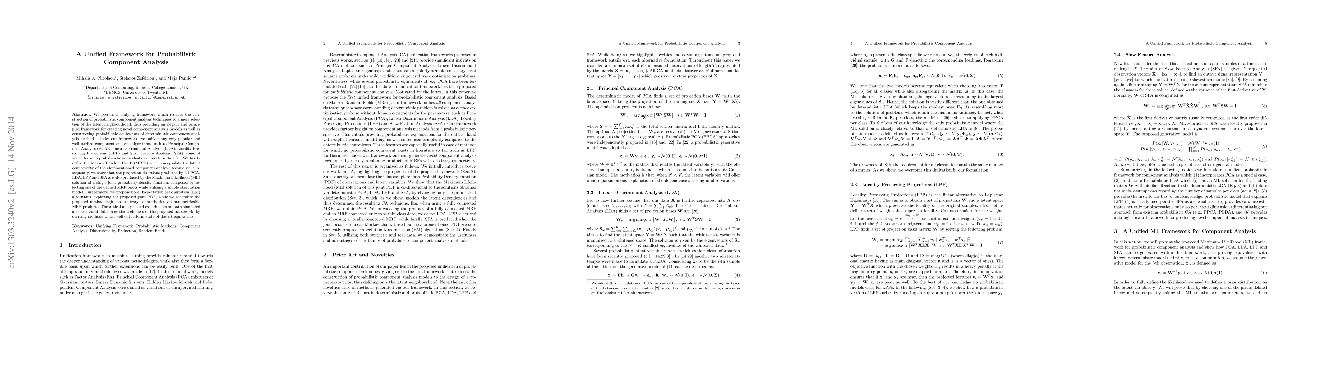 This paper introduces a unified framework for probabilistic component analysis, reducing its construction to the selection of latent neighborhood. It unifies popular algorithms like PCA, LDA, LPP, and SFA under a single probabilistic framework using Markov Random Fields and Maximum Likelihood solutions, and proposes novel Expectation Maximization algorithms that outperform state-of-the-art methods.