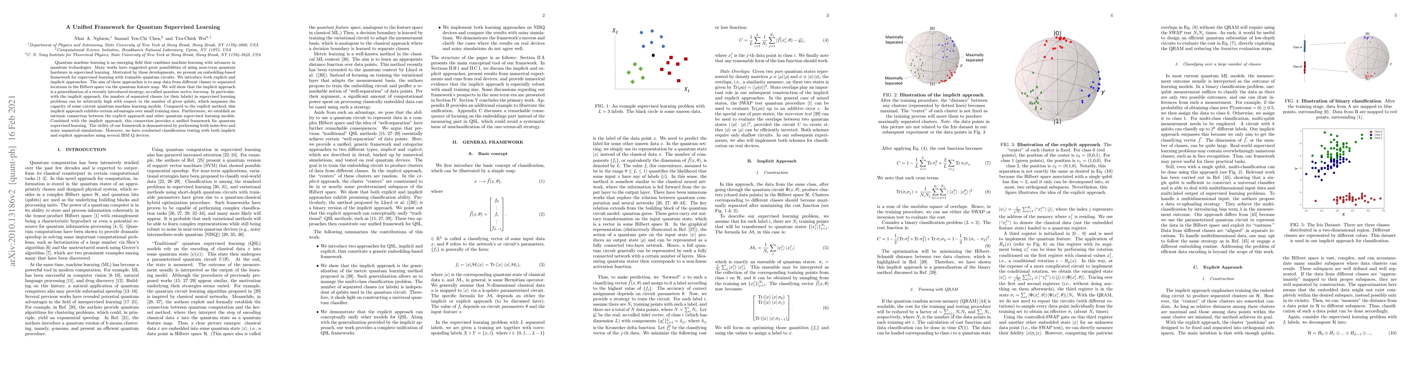 This paper presents a unified framework for quantum supervised learning using trainable quantum circuits, introducing both explicit and implicit approaches to map data to the Hilbert space. The implicit approach generalizes quantum metric learning and can handle a high number of classes, surpassing current models' capacities. The framework is demonstrated through numerical simulations and tested on IBM Q devices.
