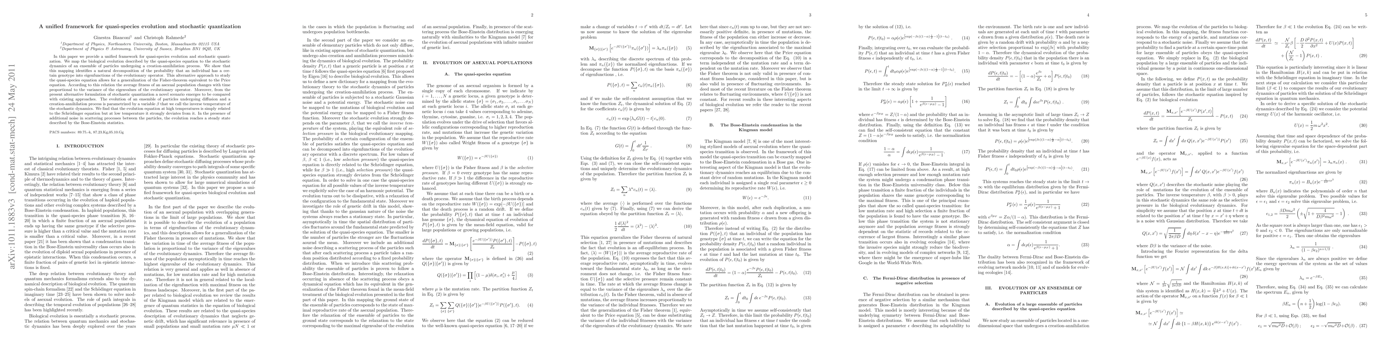 This paper develops a unified framework linking biological quasi-species evolution and stochastic quantization, revealing a new type of stochastic quantization. The study finds that the dynamics of particle ensembles relax to a fundamental state in isolation, but reach a steady state with Bose-Einstein statistics under scattering interactions.