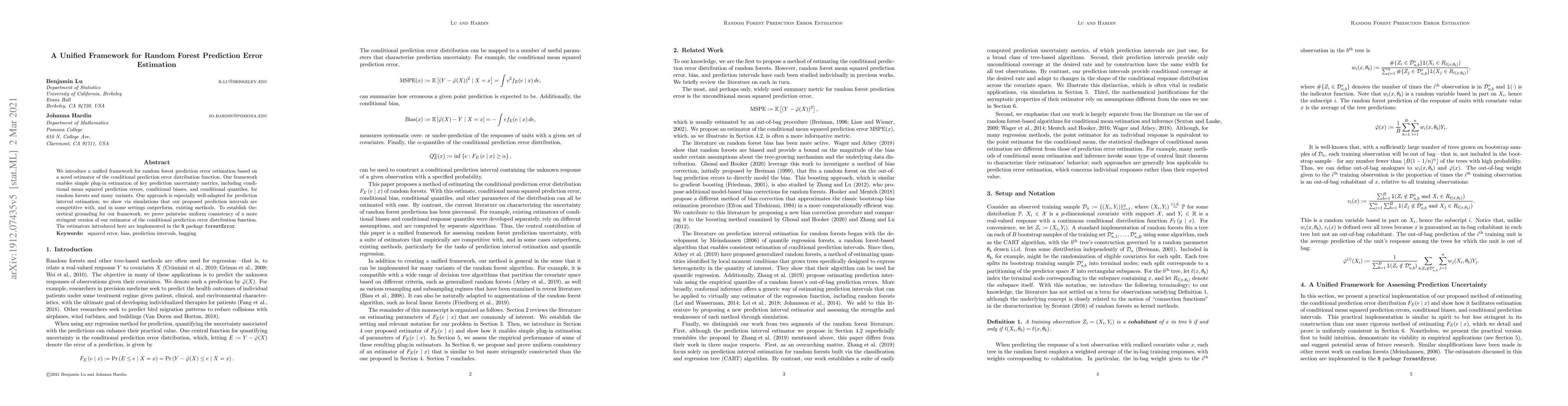 This paper presents a unified framework for estimating random forest prediction errors using a novel conditional prediction error distribution function estimator. The framework allows for accurate estimation of prediction uncertainty metrics, including prediction intervals, and outperforms existing methods in simulations.