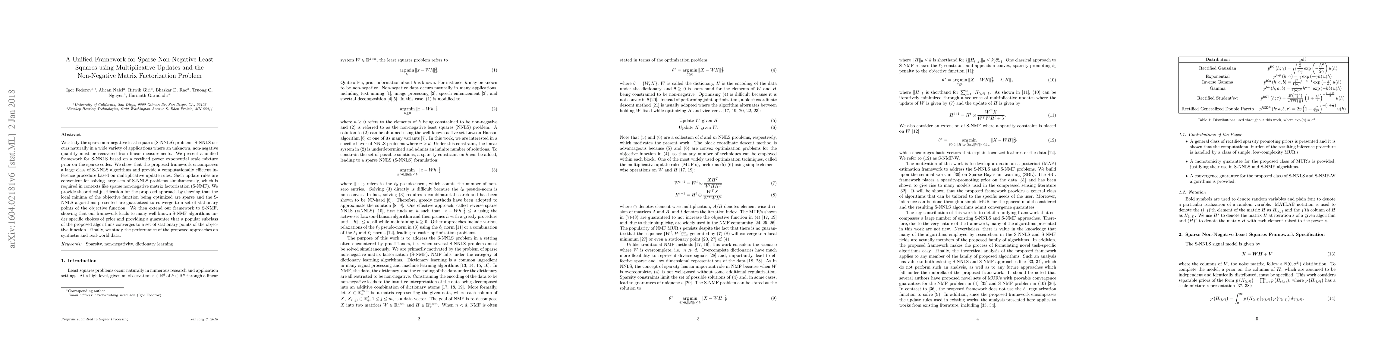 This paper proposes a unified framework for solving sparse non-negative least squares (S-NNLS) problems using multiplicative updates and connects it to the non-negative matrix factorization (NMF) problem. The framework guarantees convergence to stationary points and shows performance on both synthetic and real-world datasets.