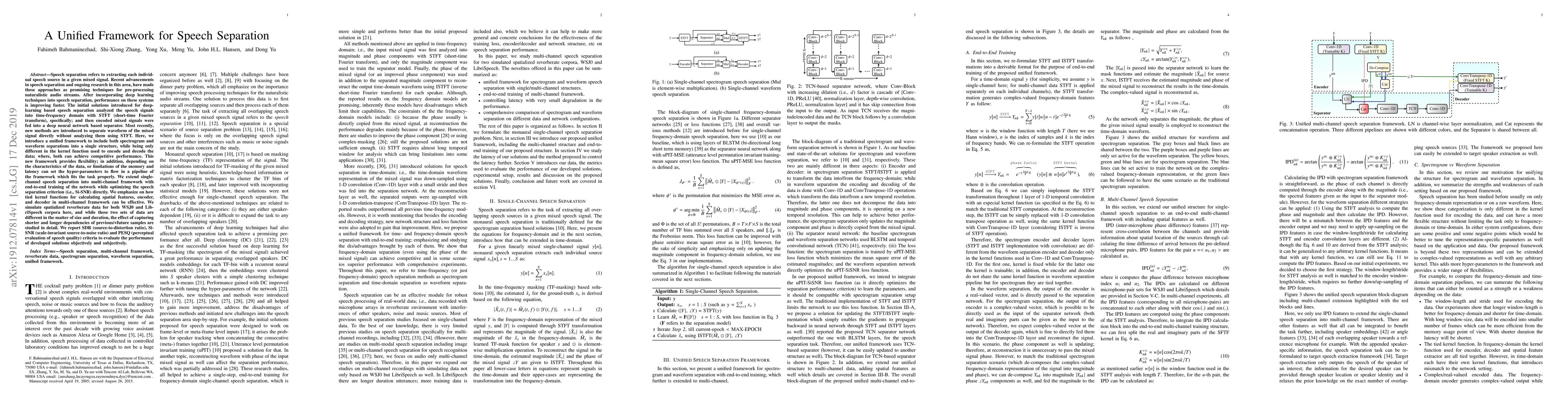 This paper proposes a unified framework for speech separation that integrates both spectrogram and waveform separation methods into a single structure, optimizing performance based on kernel functions. The framework extends single-channel to multi-channel separation with end-to-end training, demonstrating effective use of tied kernel functions and evaluating performance using SDR, Si-SNR, and PESQ.